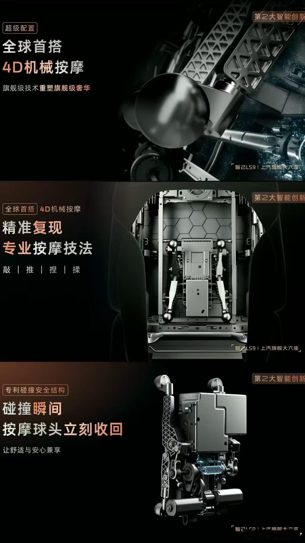 静态试了下 ,让人印象最深刻的是靠背机械按摩。不夸张的说,这套靠背机械按摩的体验水平远超过往的任何车型。也远超已经上市和即将上市的,使用“转盘式”机械按摩的车辆,例如广汽s9,鸿蒙智行等一些车等。这套系统体感很类似家用按摩椅,但上下行程会比较小。 但相比传统汽车座椅气动按摩的小打小闹,这个真的会让一部分人觉得有类似人手的感觉。这套按摩这么好,代价是什么?1.从图二也能看出来尺寸非常大,使用这套系统至少需要增加40mm厚度,所以智己在“每一列“只布置了一套,只有主驾和右后有。副驾如果配备这个在加上小桌板,厚度会达到眼睛都不能接受的地步。2.采用这套系统之后,腰托已经无法同时集成,靠背的通风也下降到等于没有的地步。另外,坐垫还是传统的气动按摩。3.对应座椅的鞭打成绩下降1-1.5分,这个能不能接受就看各家对安全的重视程度了4.实现零重力安全的话前提是座椅集成安全带,这套系统和安全带的集成困难重重。顺便说说发现的ls9的几个小问题,主驾驶高调的时候四个角不同步,副驾零重力翻转速度太快了吓人,二排腿托太短了不舒服。