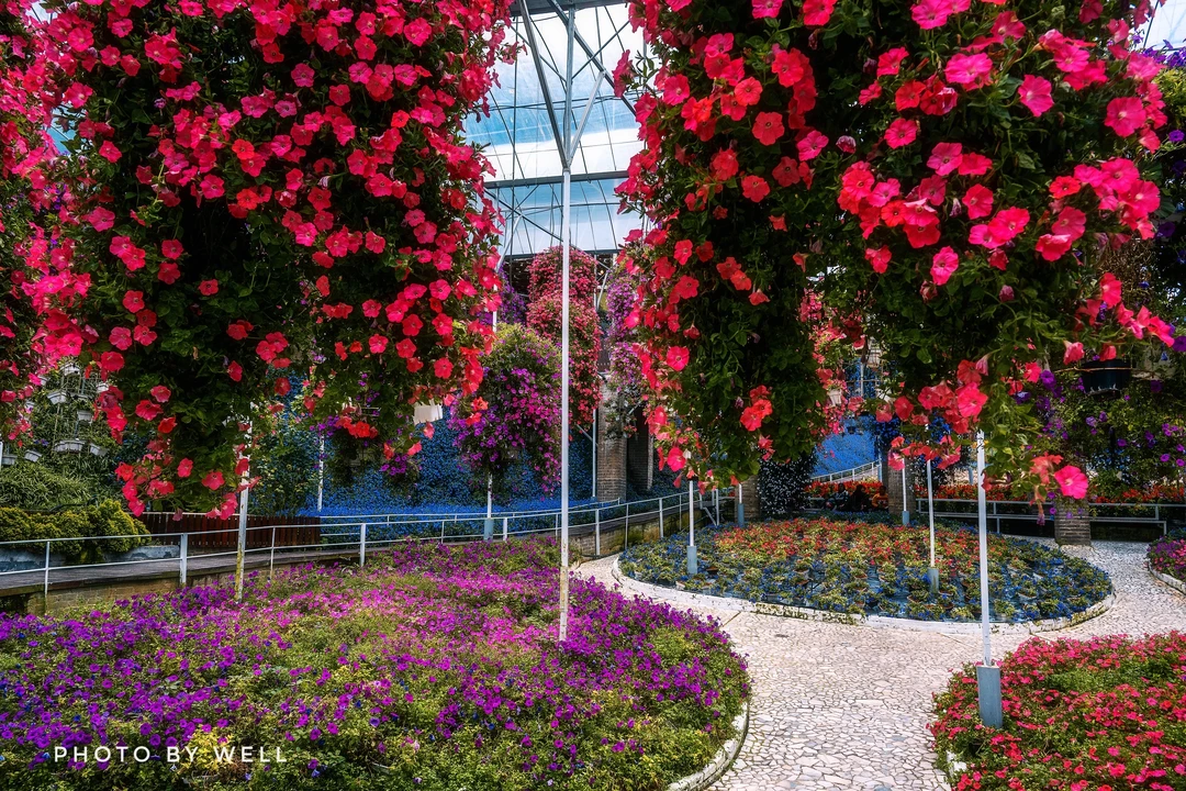 一进入公园,你会看到不同花园中种植的百万株矮牵牛花,以及超过10,000株不同品种的花卉,形成一片色彩斑斓的海洋。公园里设计了许多非常适合拍照的景观和设施,可以在这些地方留下美丽的身影:心形花卉隧道,彩虹楼梯,无限阶梯(利用视觉错位),金枫桥(提供鸟瞰视角)等。