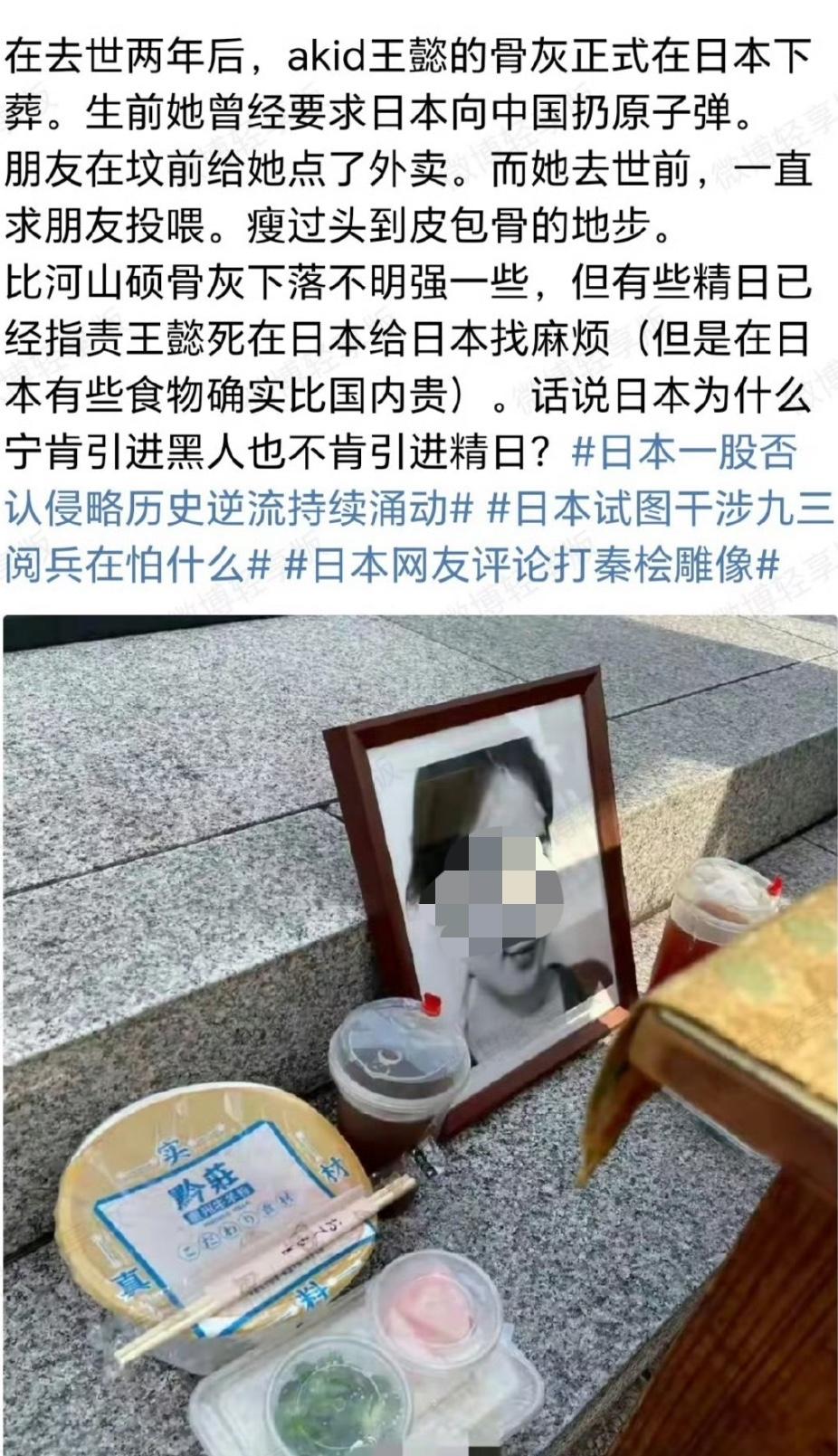 那个呼吁日本向中国投原子弹的精日,最终还是在日本被活活饿死,她的墓前摆着朋友为她点的便当和最爱的奶茶,活着的时候无人帮助死后终于吃上了饭 确实很可悲但也是自找的,即使在快断气之前她还在不断地埋怨着国家,然而造成这一切的都是她自己鬼迷心窍,哪怕在国内老老实实打份工也不至于被饿死