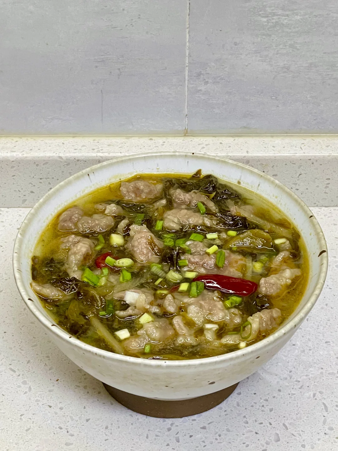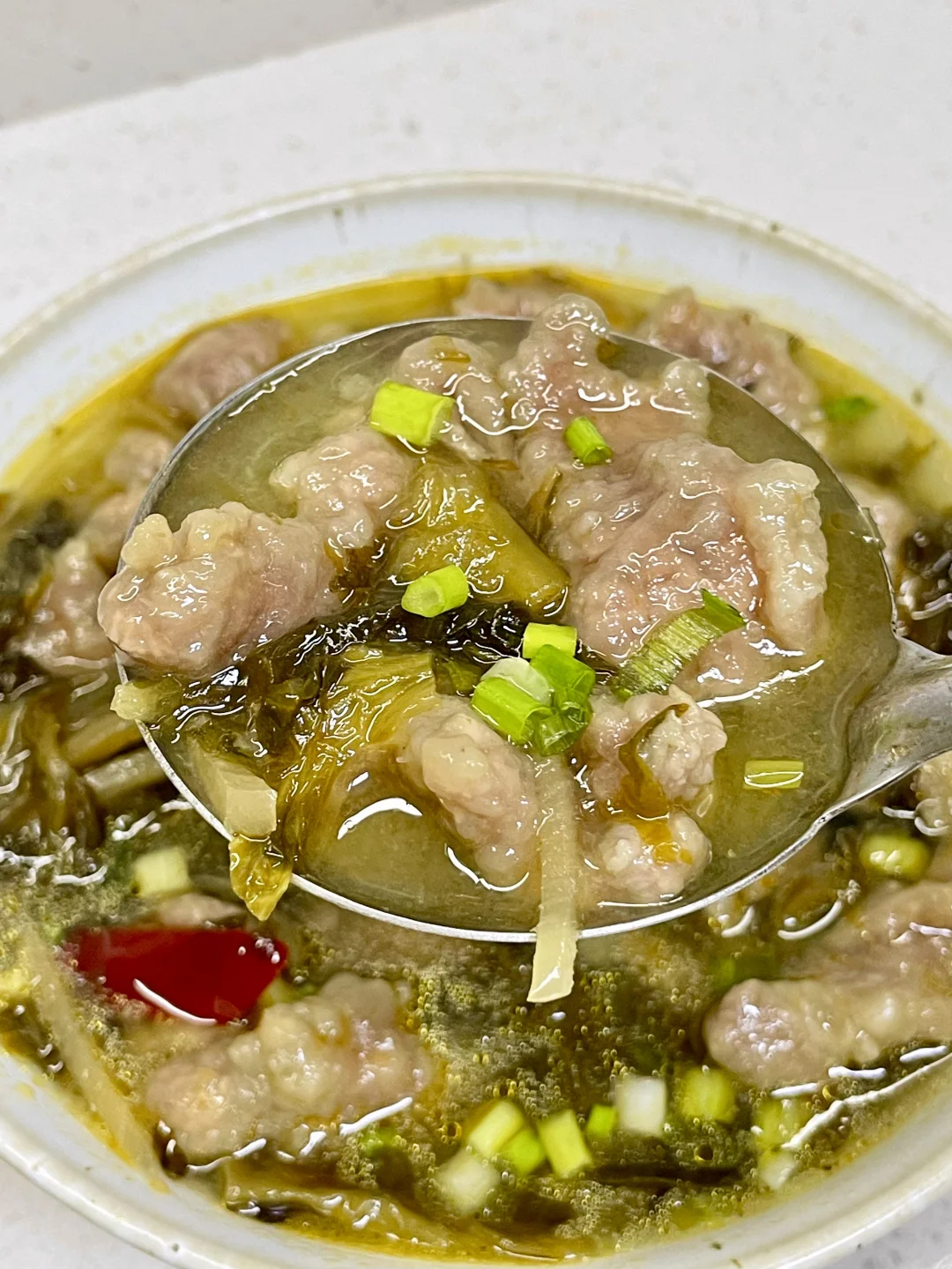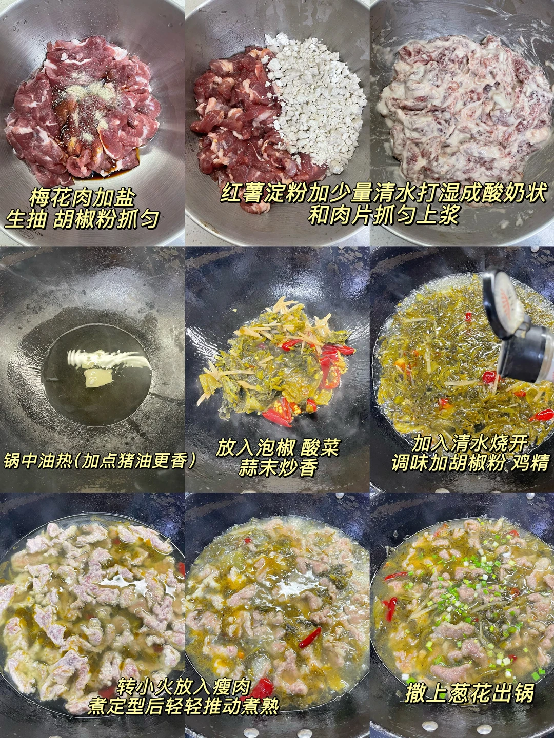 酸菜滑肉汤也太开胃了,肉质嫩滑,汤鲜味美的酸菜滑菜滑肉,味道咸淡适中,汤汁都可以喝完~ 1️⃣:梅花肉加少许盐 生抽 胡椒粉抓匀,红薯淀粉用少量清水打湿成酸奶状,倒入肉片中抓匀上浆 2️⃣:锅中油热(加点猪油更香)倒入泡椒 酸菜 葱姜蒜炒香,加入适量清水,加入少许胡椒粉 鸡精调味,水开转小火放入瘦肉,煮定型后轻轻推动,转大火煮开后关火,撒上葱花即可