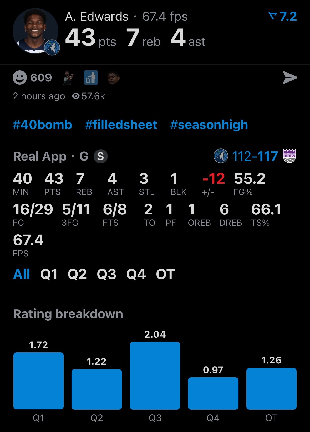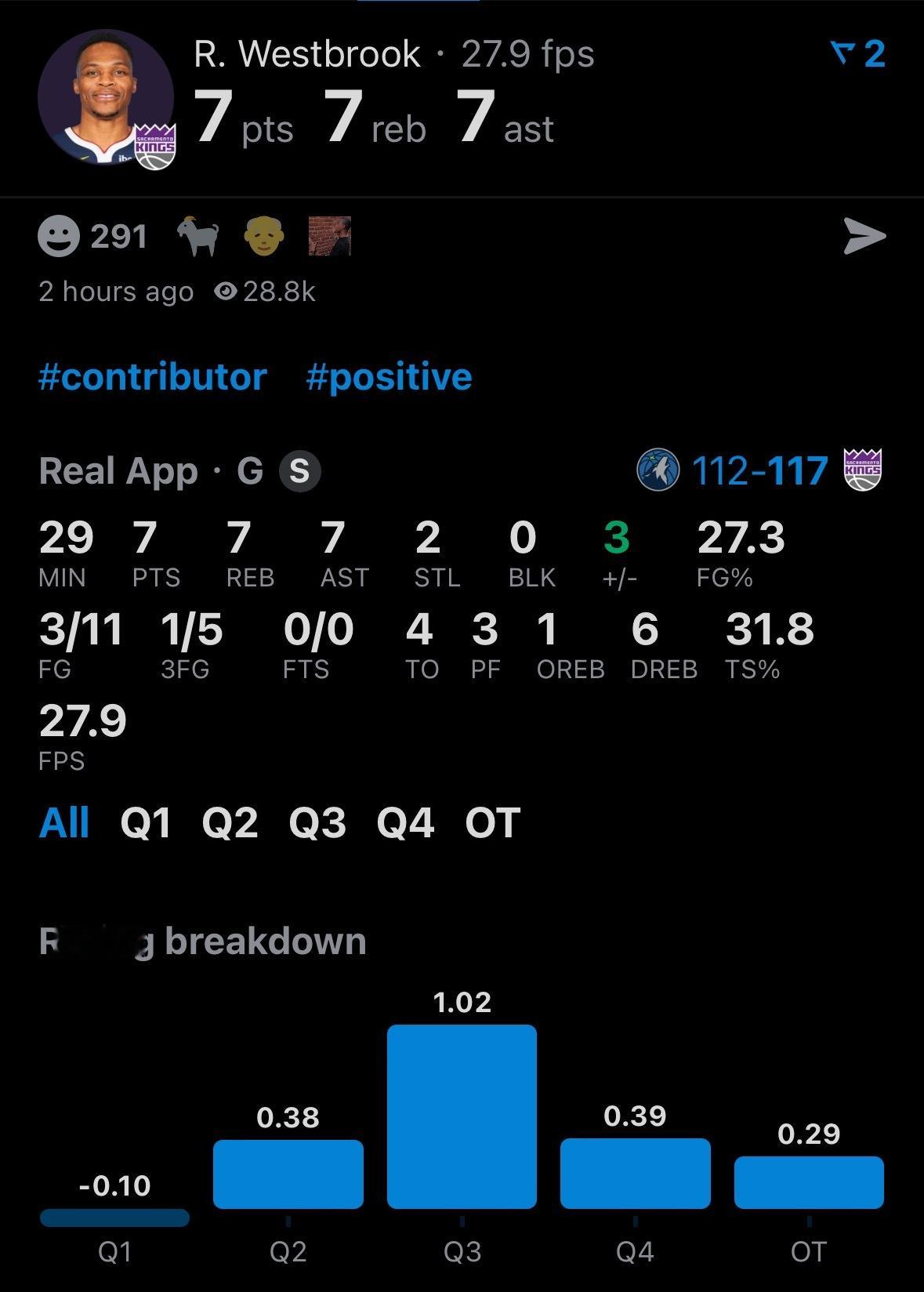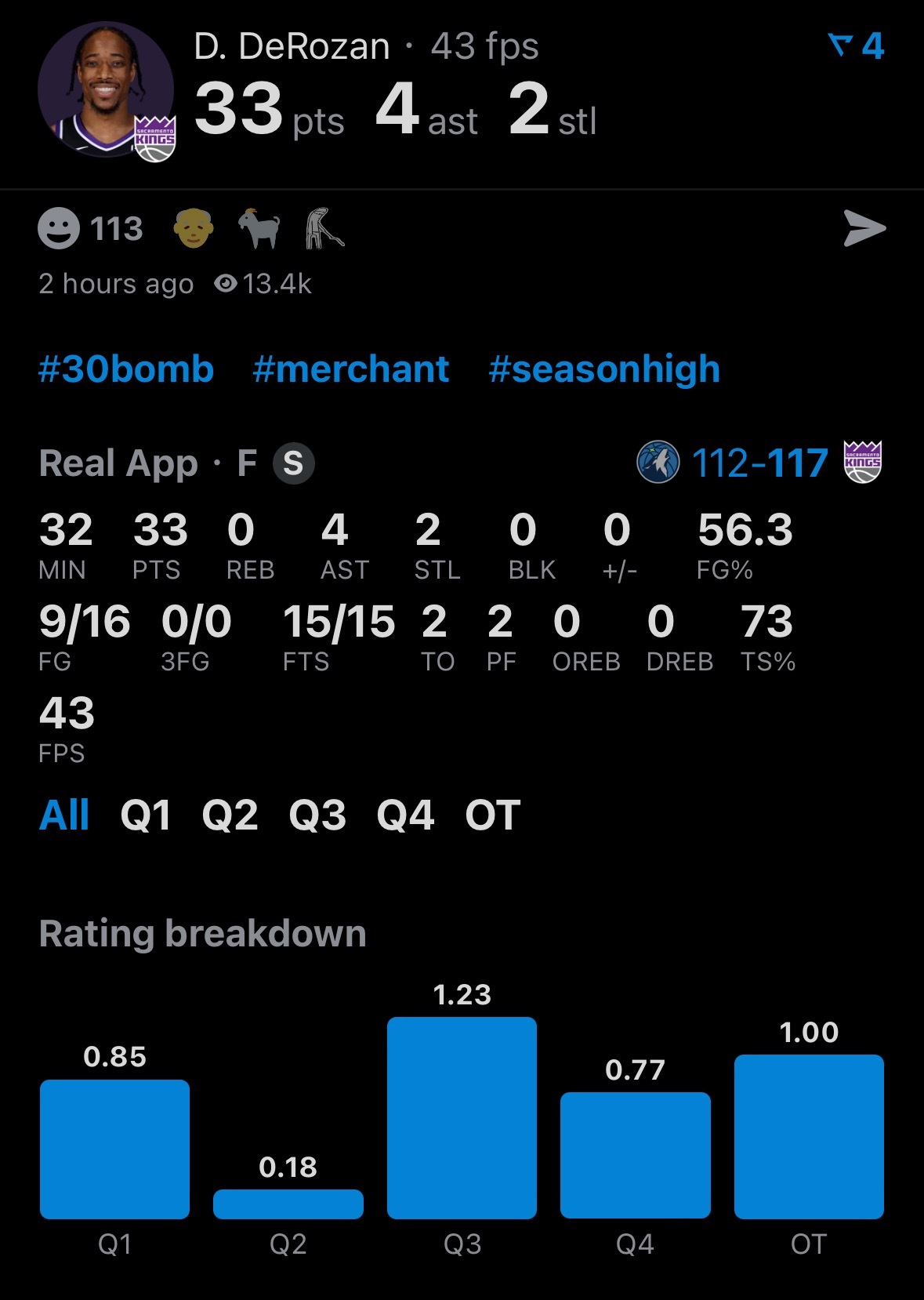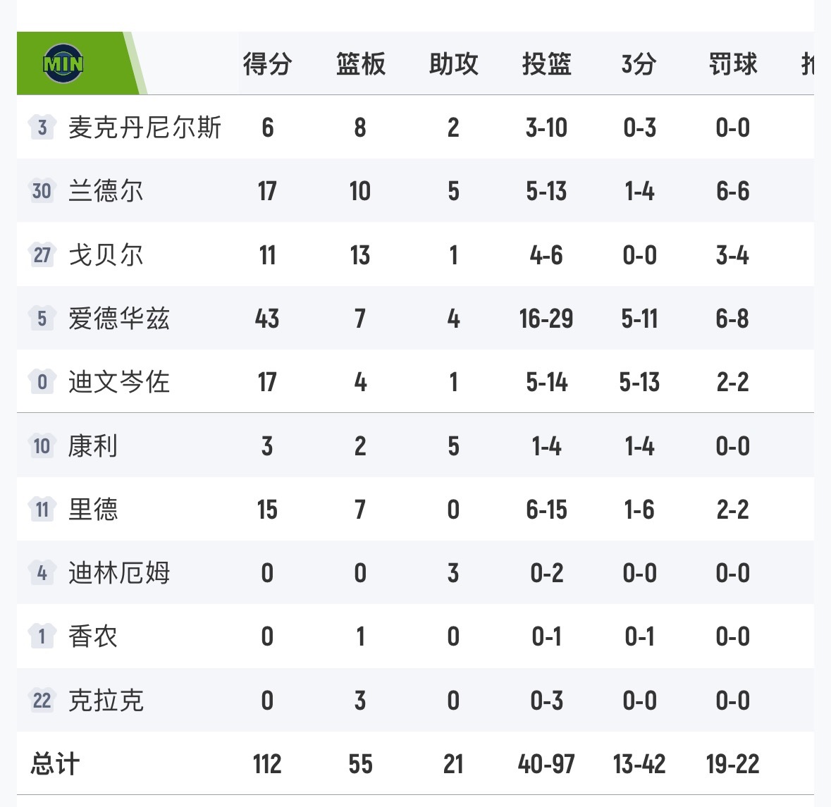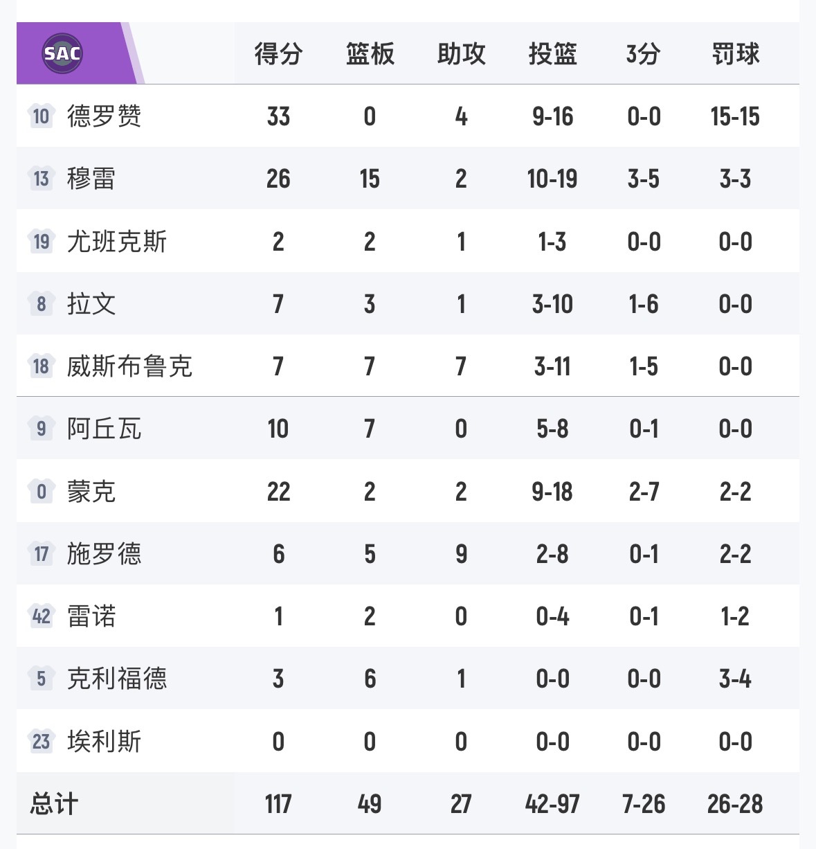 国王加时击败森林狼,获得赛季第五胜。德罗赞33分,15罚15中,威少7分7板7助攻。爱德华兹空砍43分7板4助攻。