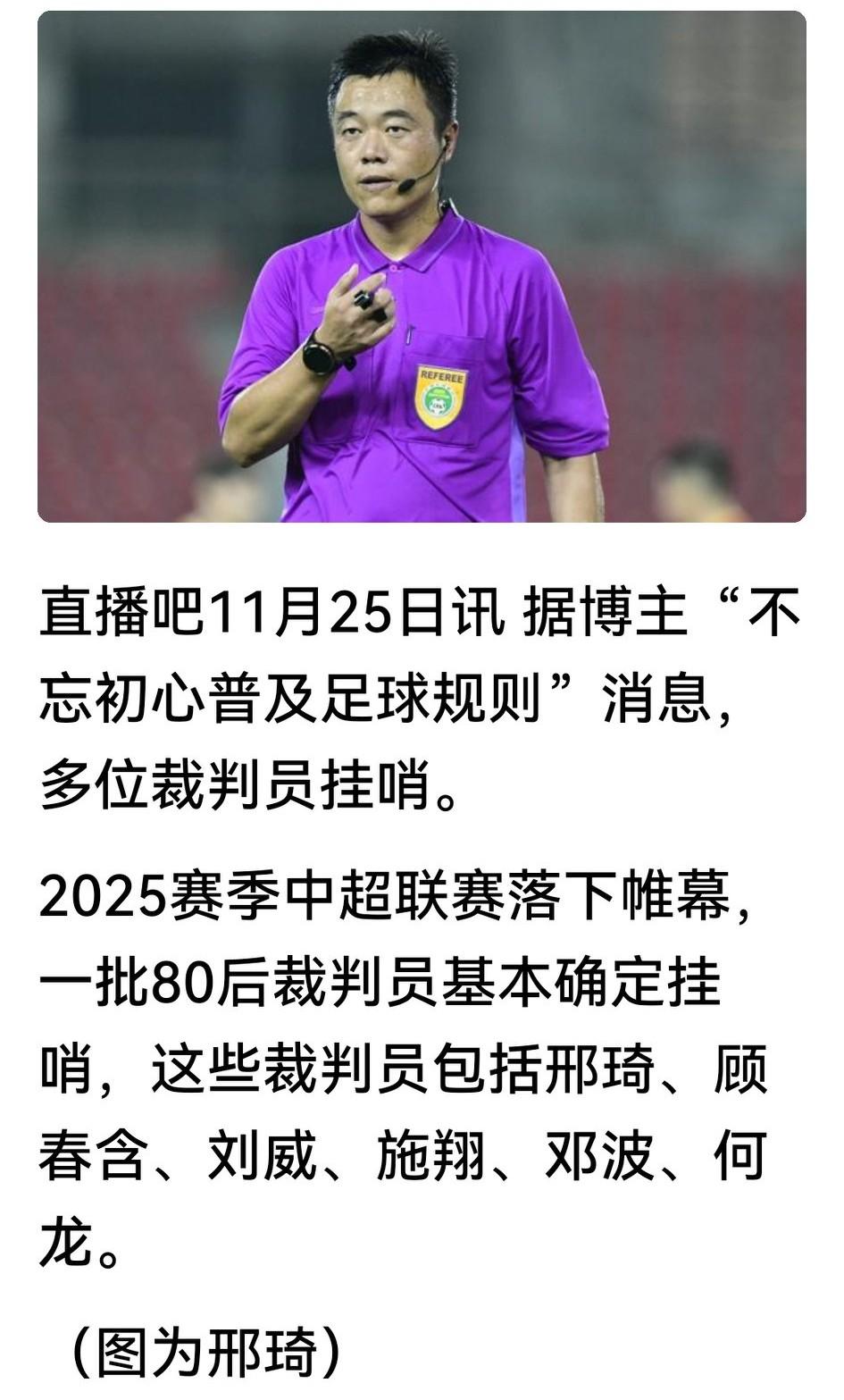 哈哈,直播吧报道一批裁判(邢琦、顾春含、刘威、施祥、邓波、何龙)挂哨的消息,没有网友送上祝福,却引来大批网友惊喜,憧憬裁判界迎来新天地。 其实,这批80后裁判挂了,但报道并非说他们有问题,大概率是年龄大了体能和眼神难以为继。比如浙江主场对蓉城的那位叫单丹澳的主裁,比赛才76分钟就抽筋,居然在场上和刘殿座抢队医。但网友乐的不是这个,而是对邢琦和顾春含等人执裁公正性的质疑。 尽管如此,还有网友不满意,把马宁、艾堃、买买提江、唐顺齐等人抬出来,要求他们退役,更有人要求送他们去见李铁[捂脸]。这么不受人待见,中超的裁判真是尴尬至极。