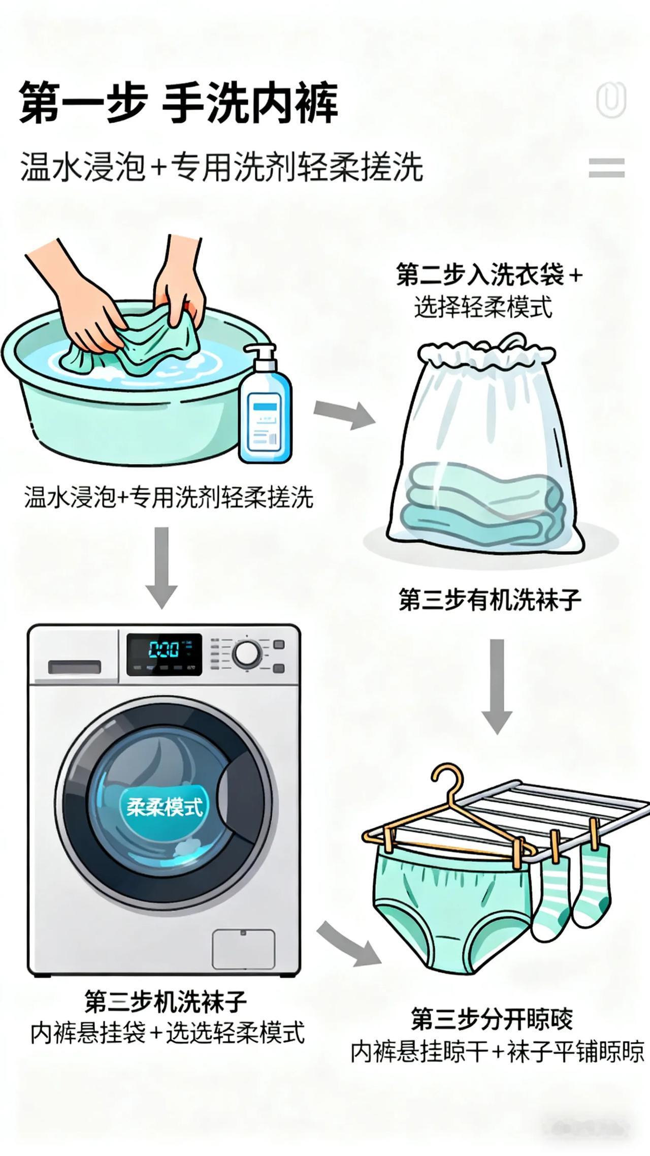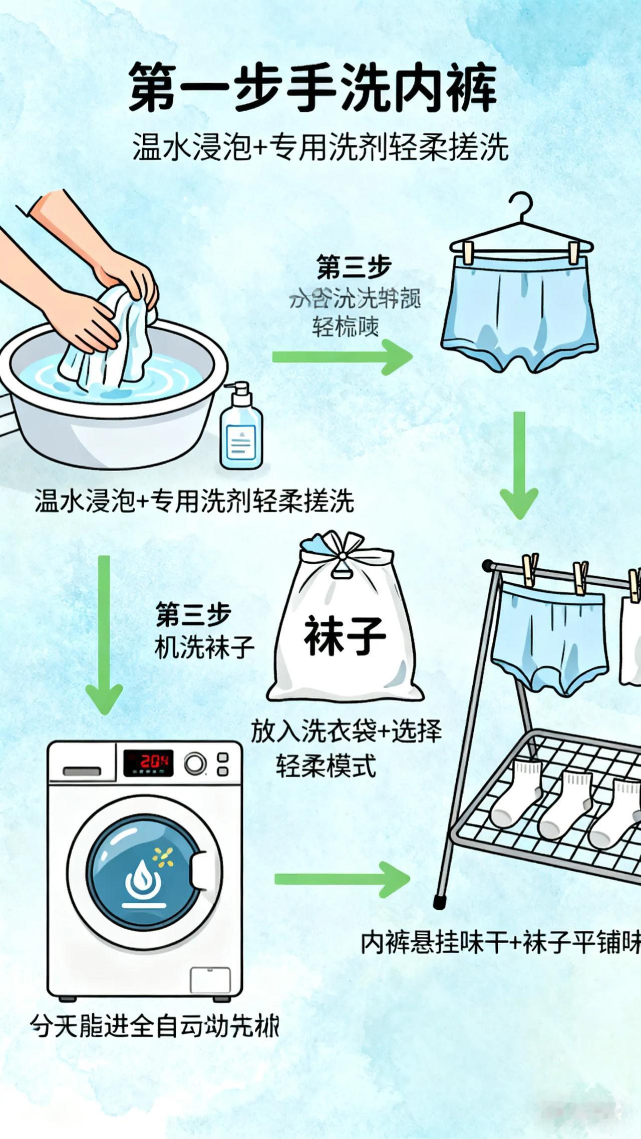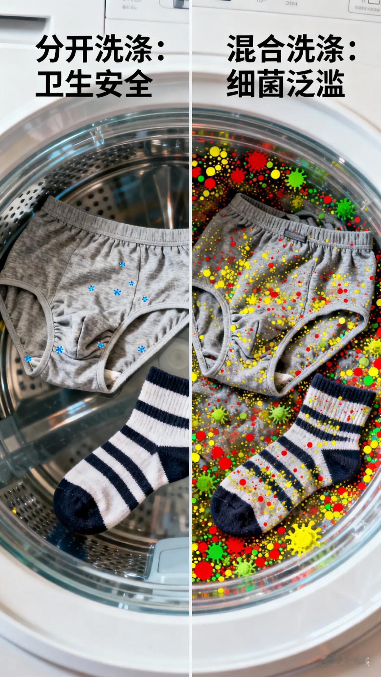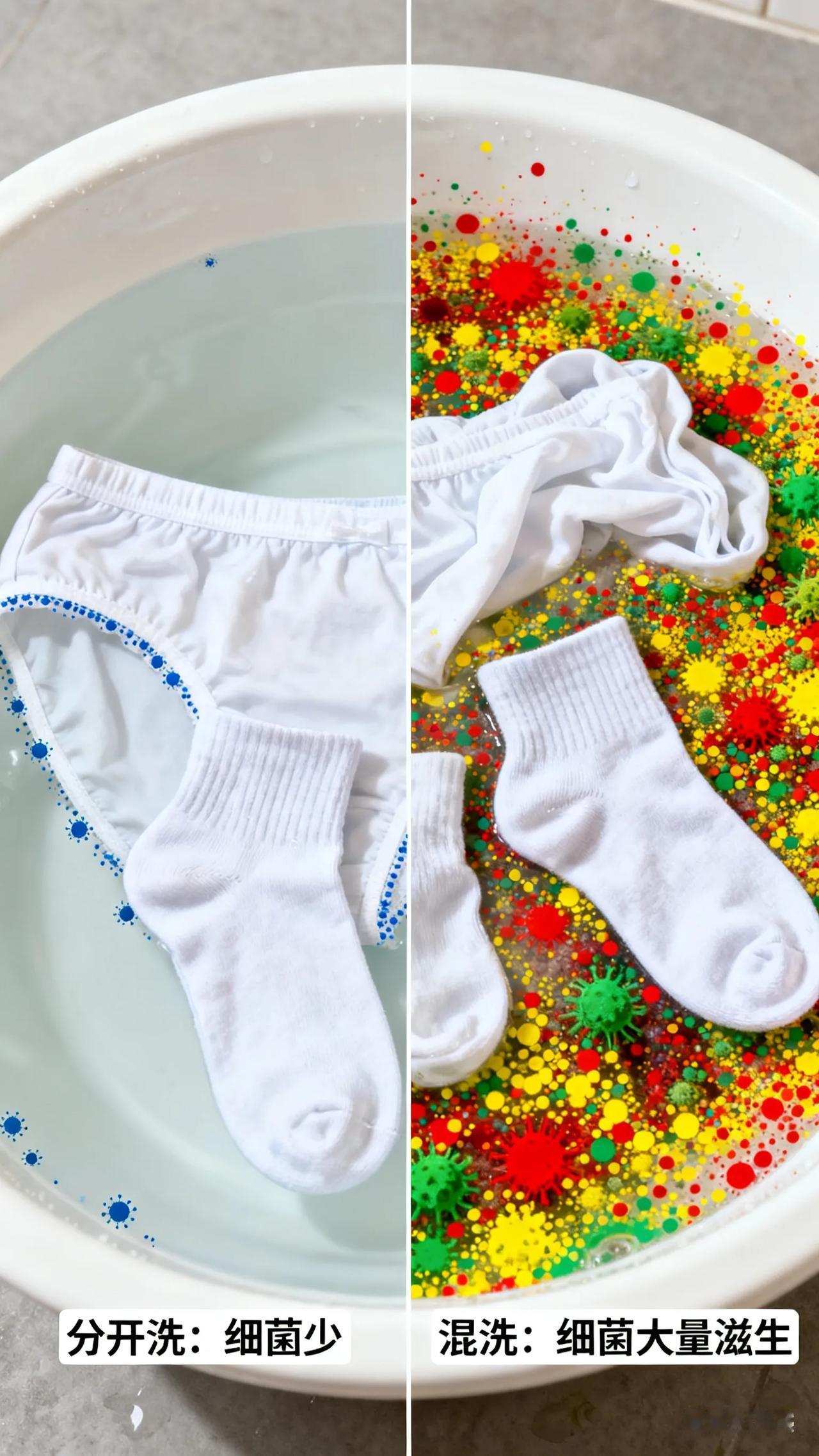 答案:必须分开洗! 这可不是矫情,而是关乎健康的大事! 👉 为什么要分开洗? 1. 细菌狂欢派对警告 袜子上的真菌(比如脚气)和内裤上的大肠杆菌、分泌物“同框”,洗衣机瞬间变“细菌培养皿”。混洗后,妇科病、股癣、灰指甲可能集体“上门拜访”。 2. 分泌物残留很危险 生理期分泌物、尿液残留等在内裤上的蛋白质,混洗时容易附着在袜子纤维里,成为细菌滋生温床,反过来又污染内裤。 3. 材质差异毁衣物 内裤多为棉质,需要温柔对待;袜子含氨纶、化纤等,混洗容易勾丝、变形,缩短使用寿命。 👉 科学洗法指南 ✅ 手洗内裤:用专用盆+内衣皂,重点搓洗裆部,30秒就能减少90%细菌。 ✅ 袜子单独机洗:加消毒液,40℃以上水温,高温能杀死大部分真菌。 ✅ 洗衣机分区:有条件的家庭,可以用“迷你洗衣机”专门洗内衣裤。 👉 这些误区要避开 ❌ 认为“洗衣机有消毒功能就安全”:普通高温洗只能杀部分细菌,真菌需要60℃以上持续加热。 ❌ 用“柔顺剂代替消毒”:柔顺剂不杀菌,反而可能残留化学物质刺激皮肤。 ❌ 晾晒时“亲密接触”:内裤和袜子分开放置,避免交叉污染。
