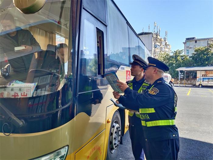 执法人员向大巴车驾驶员面对面安全教育时的情景