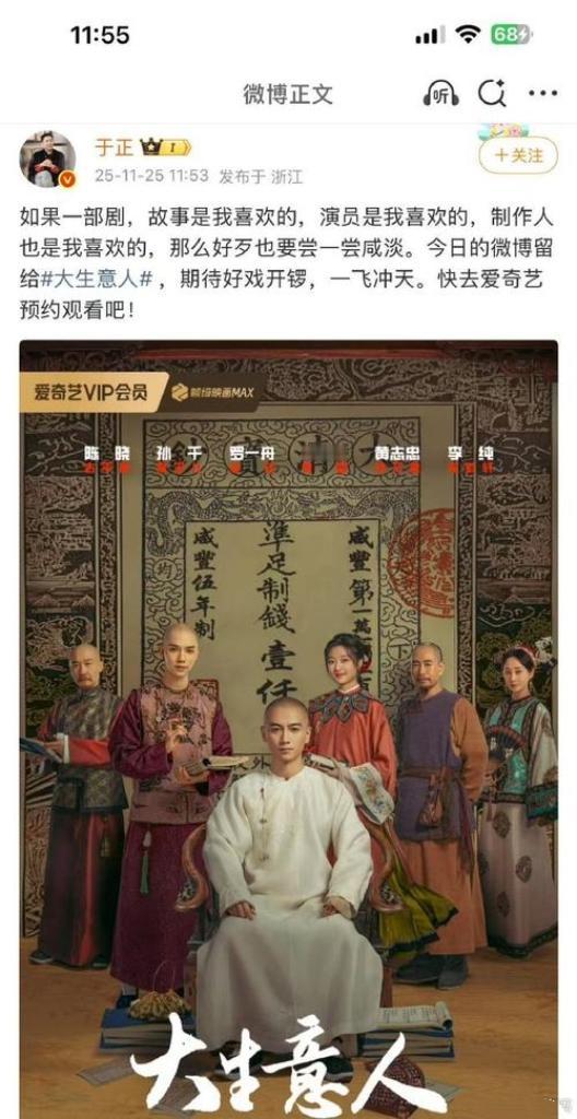 于正为陈晓新剧《大生意人》高调打call,一句“即使不再是同事,也依然是心里的家