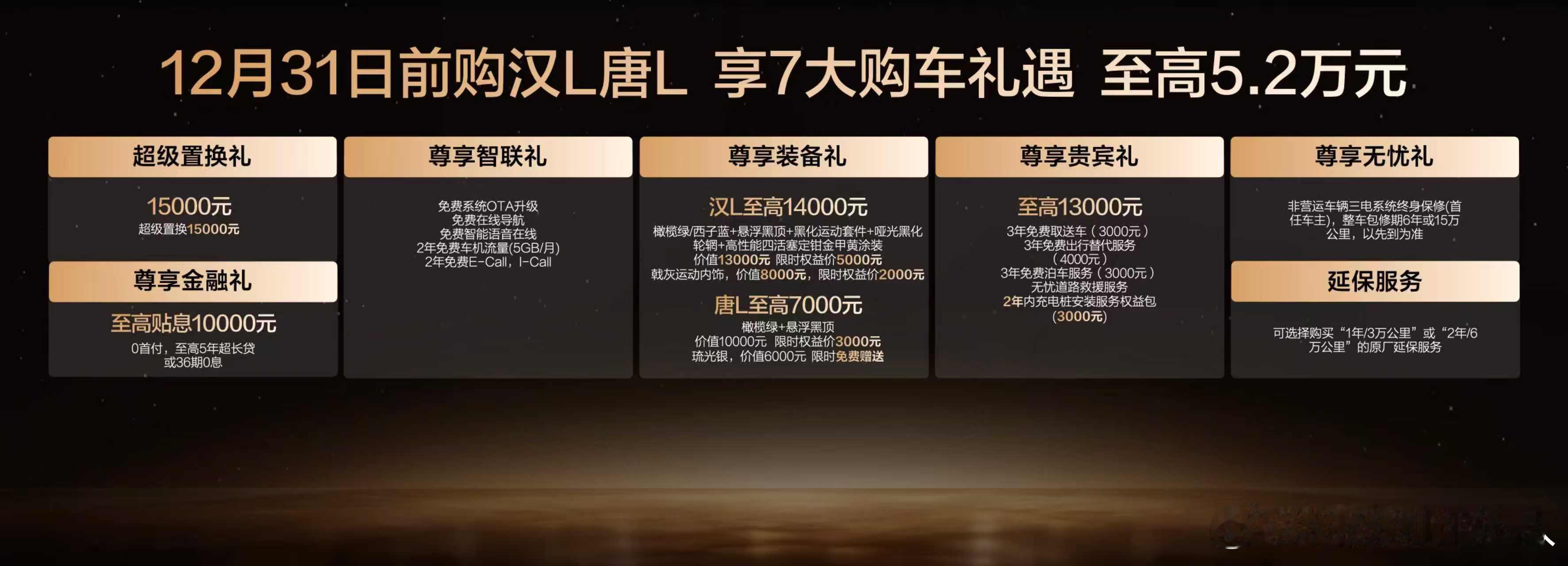 现在新能源市场真是越来越卷,比亚迪在技术和销量上已然遥遥领先,前进的步伐却丝毫不敢懈怠。11月21日,比亚迪划时代旗舰车型汉L唐L携新车色及OTA正式发布,19.48万起的补贴售价,直接把高端配置拉到了亲民价位,这次全维进化确实太猛了!先看大家最关心的补能和动力,超级e平台的全域千伏架构,1000kW峰值充电功率,5分钟补400公里续航,这效率直接把纯电补能焦虑拉到最低。纯电版本零百加速最快2.7秒,混动版也才3.9秒,性能账面数据堪称同级天花板,还拿了“中国心”年度十佳动力系统,技术实力肉眼可见。颜值这块完全长在审美点上,“科技满配颜值翻倍”,龙颜美学基础上新增的橄榄绿和西子蓝太会了。橄榄绿绿中透金,西子蓝随光线变深浅,低饱和度的质感真的很高级,汉L的黑化运动套件更是把运动感拉满,光看图片就觉得气场十足。智能升级的“车位到车位”领航辅助太实用了,从出库到跨楼层泊车全程自动完成,不用手动接管的体验想想就省心。DiLink座舱的全新UI和萌宠动态主题,让科技感多了份温度,还有“人×车×家”互联功能,车和家能无缝联动,日常用车很方便。现在还有置换补贴和限时选装福利,原本一万三的外观套装五千块就能拿下,唐L的琉光银还能免费选装。这波配置和权益叠加,确实让中高端新能源市场多了个极具竞争力的选择。
