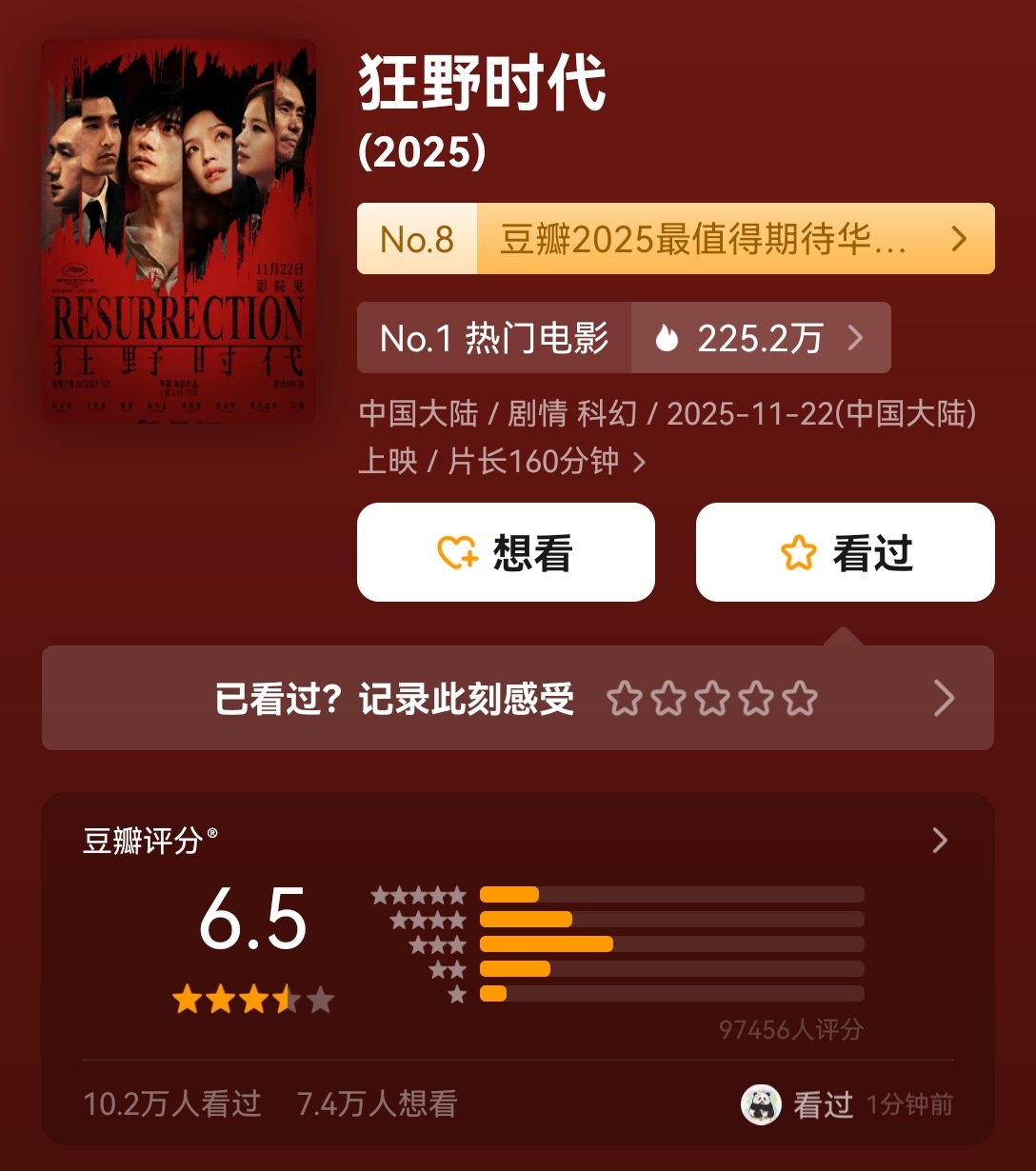 你如果去解读英文片名resurrection,就很容易过度解读。毕赣抛却了一部分为自己赢得声誉的诗性,实际上,《狂野时代》的结构是超现实主义的史诗结构,有宏大叙事的野心,文本层面很像要去争夺茅盾文学奖史诗题材那一脉的面相。这里面有一些重的东西,是“我思”。