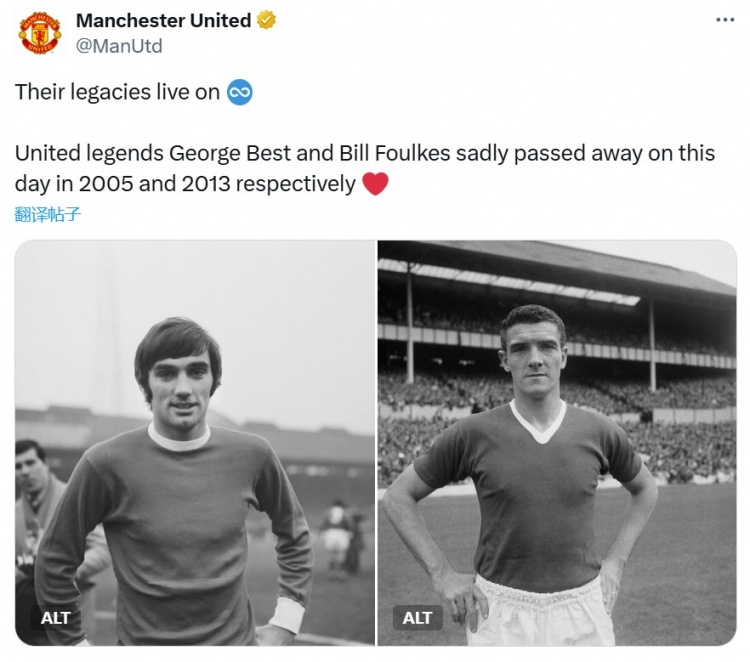 今天,曼联官方纪念贝斯特和比尔·福克斯,并配文: