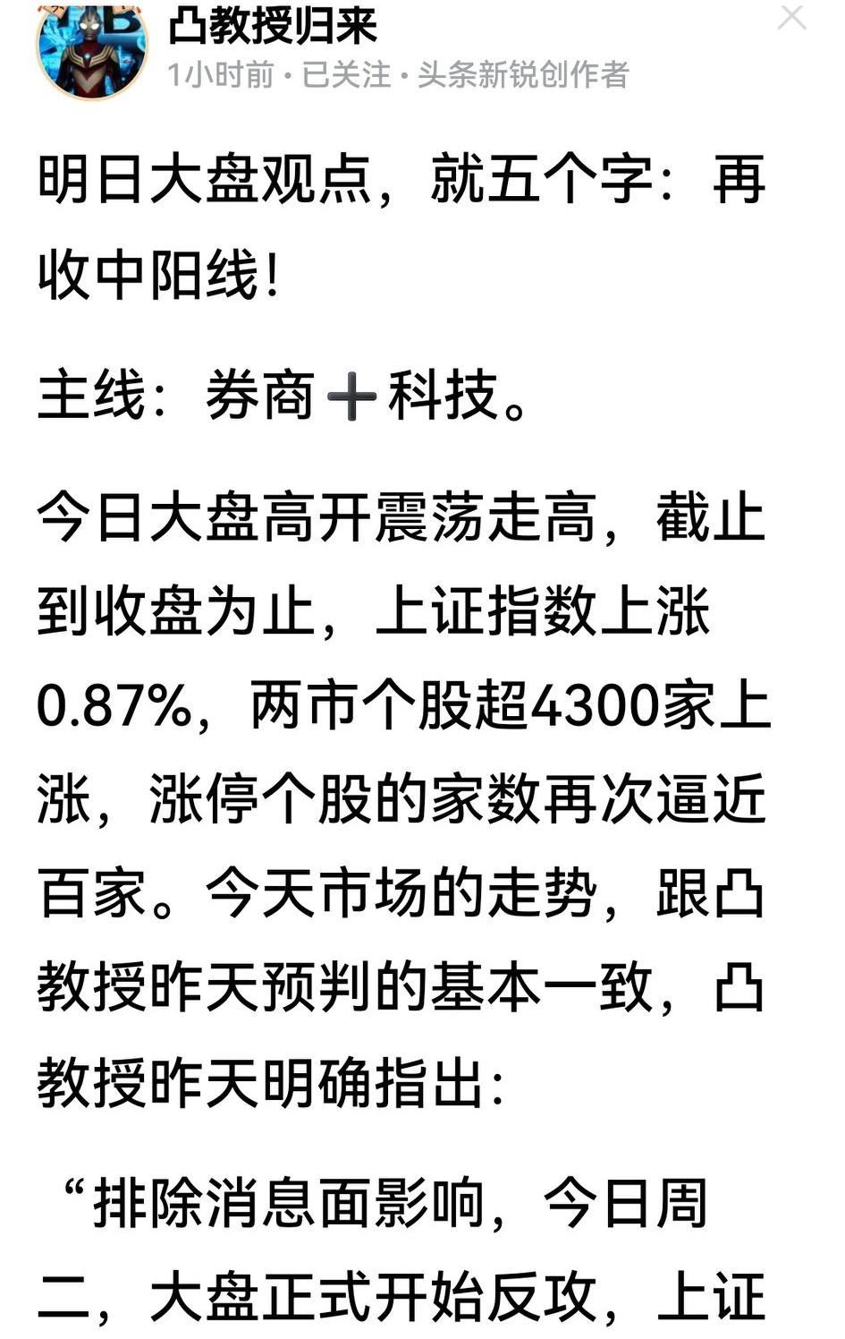 不得不说,凸教授解除自闭,大盘周一就探底回V,今天又拉出中阳,让岌岌可危的大A再度逆袭,这玄学不得不服气。 老凸的主线一直是“券商+科技”,其逻辑是券商打地基、科技提人气。说前者已被市场证明无需多言,说后者却不能让人同意,毕竟市场没人券商这个理,高层也不会让券商股做妖让大A短期就夭折。 老凸说明天继续收中阳,若再 得到验证,那就证明昨天的深V是成功探底、今天的大涨并非下跌中继。但凸迷也得留个心眼,军工股受外围形势影响可望卷土重来,业绩空窗期的低价题材股可能粘上跨年妖股的话题,“券商+科技”未必是唯一主线主题。