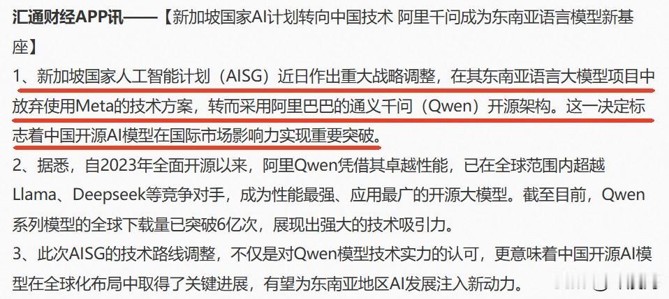 太给力了!中国AI刚刚完成了一次漂亮的"出海远征"! 就在这两天,新加坡国家级人工智能计划正式宣布,全面采用我国自主研发的通问千义大模型,取代了之前使用的美国Meta技术! 这个消息有多重磅?这就好比在科技领域,我们中国的高铁又一次开出了国门!新加坡作为全球科技创新高地,这次毅然放弃西方技术路线,选择中国方案,充分证明了我国AI技术的硬实力。 要知道,东南亚的语言环境特别复杂,印尼语、泰语、马来语等各种方言交织,西方AI模型在这里一直"水土不服"。而我们的千问大模型却能游刃有余,在处理这些语言时分词效率直接比西方模型高出40%以上!这不仅是中国速度,更是中国精度! 更让人振奋的是,这场中国AI的全球突围战已经多点开花。硅谷大佬们纷纷为我们站台:英伟达CEO黄仁勋多次点赞,AirbnbCEO直言我们的模型"比OpenAI更好更便宜",连苹果、亚马逊这样的科技巨头都在悄悄使用我们的技术。 目前,千问模型的全球下载量已突破6亿次,衍生出超过17万个模型变体。从东亚的日本、韩国,到中东的阿联酋,全球开发者都在基于中国技术构建他们的AI未来。这种盛况,让人不禁想起中国高铁走向世界的辉煌历程! 这是中国科技的历史性时刻!从北斗导航到5G通信,从高铁技术到人工智能,我们正在一个个高科技领域实现从追赶到引领的伟大跨越。事实证明,在决定未来的科技赛道上,中国不仅不会缺席,更要领跑世界!