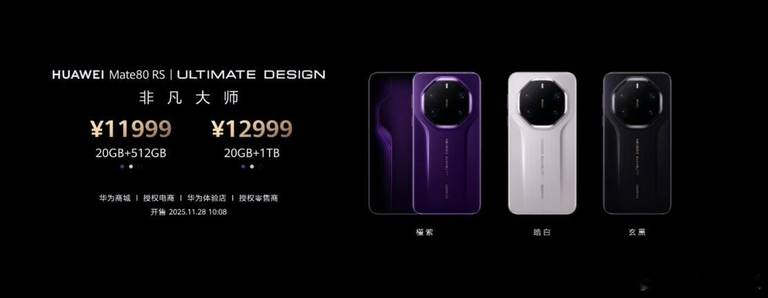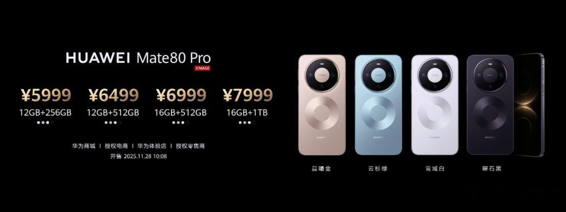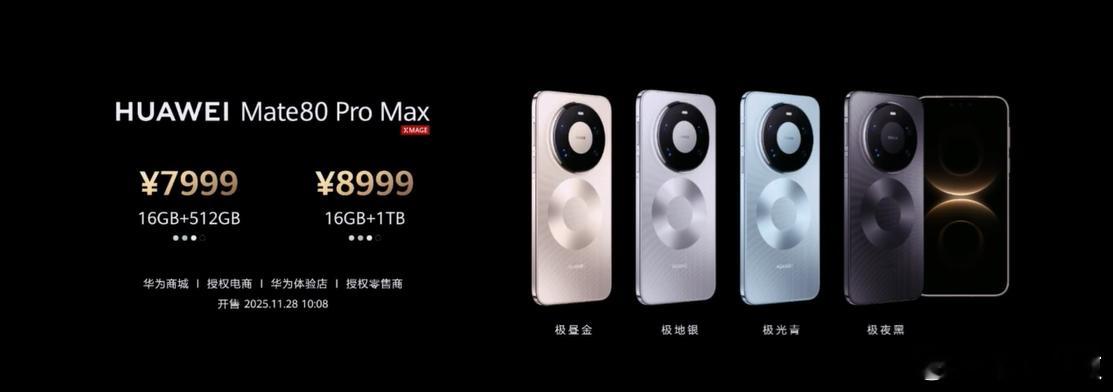 公布Mate80:12+256G 4699元12+512G 5199元16+512G 5499元Mate80 Pro:12+256G 5999元12+512G 6499元16+512G 6999元16G+1TB 7999元Mate80 Pro Max:16+512G 7999元16G+1TB 8999元Mate80 RS:20+512G 11999元20G+1TB 12999元