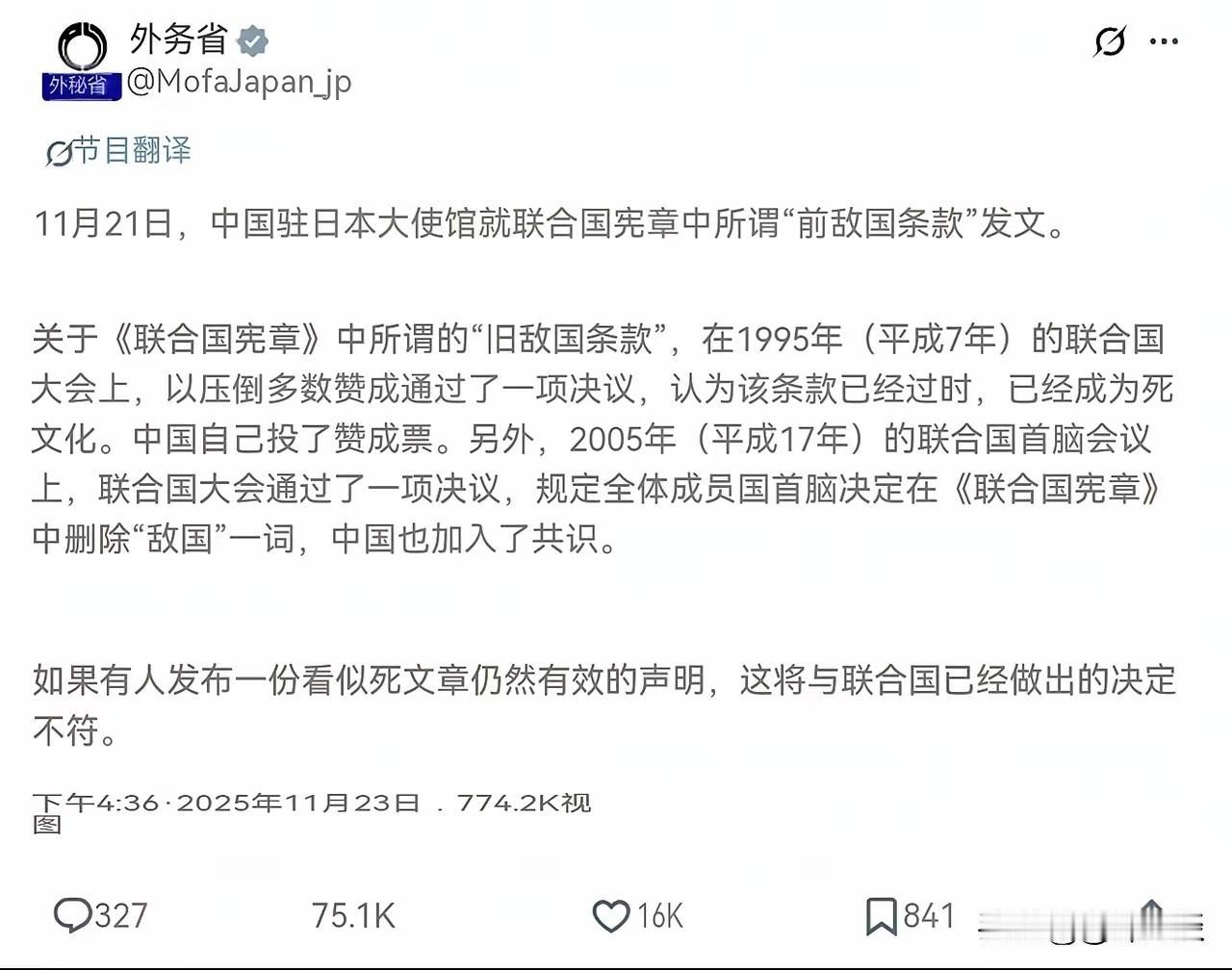 日本外务省说,联合国宪章中敌国条款已经失效了。因为在1995年和2005年两次投票都建议删除敌国条款,中国参与了投票并投了赞成票。特意查了一下1995年和2005年,当时只是部分成员国建议删除敌国条款,但是实际上并未删除敌国条款。因为要删除这些条款,必须要经过联合国会员2/3 以上同意,以及五大常任理事国一致同意才能删除。但是截止目前,没有任何的联合国决议通过删除敌国条款,根本就没有这个程序,只是建议删除,仅此而已。就目前的形势来看,敌国条款永远都不能删除,特别是关于日本的敌国条款,必须毫无保留的保存在联合国宪章当中,以防止日本军国主义复辟。所以,敌国条款仍然是有效条款,只要日本有所行动,我们就可以以敌国条款不经联合国的批准,直接对日本实施打击。日本不但在言语上挑衅我们,而且在行动上也在不断的做小动作,在距离中国台湾只有100多公里的小岛上部署中程导弹,很明显这是针对我们的,日本帝国主义亡我之心不死,所以对于日本,我们永远应当保有警惕之心。