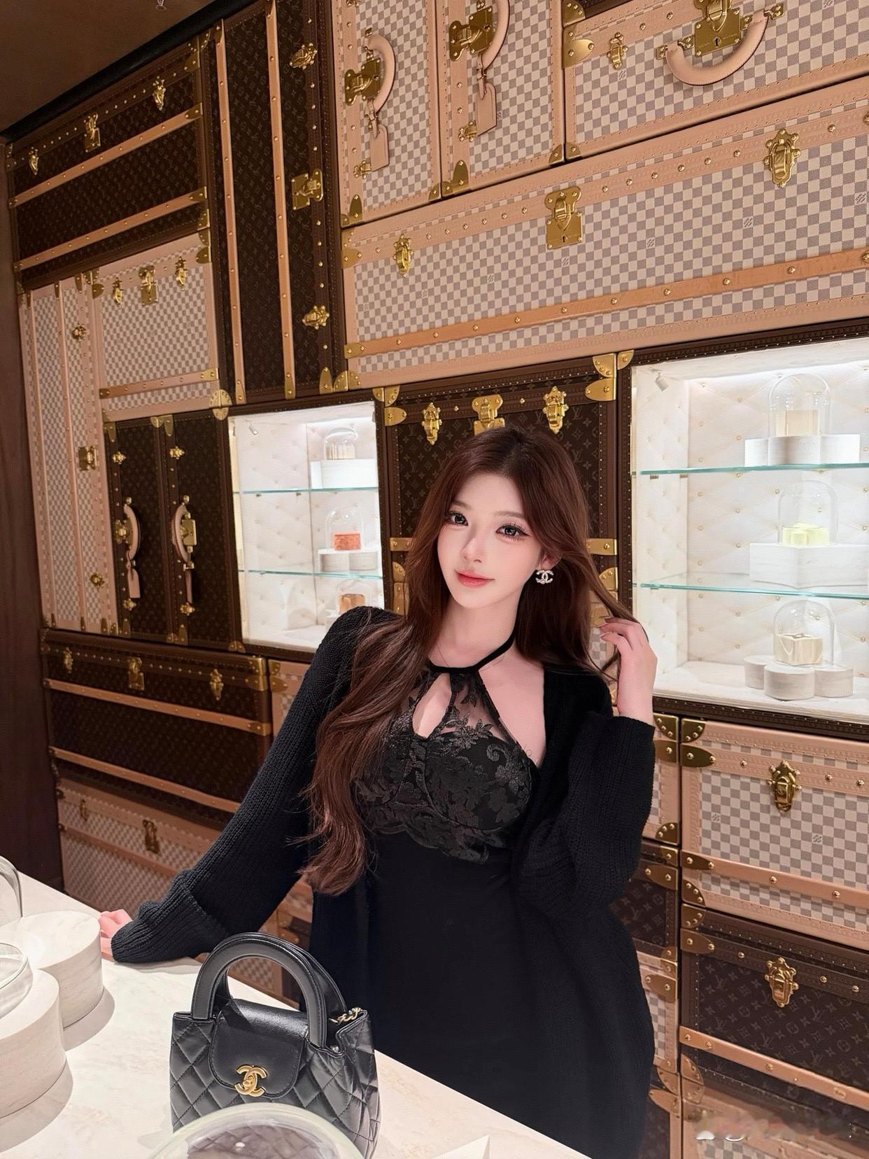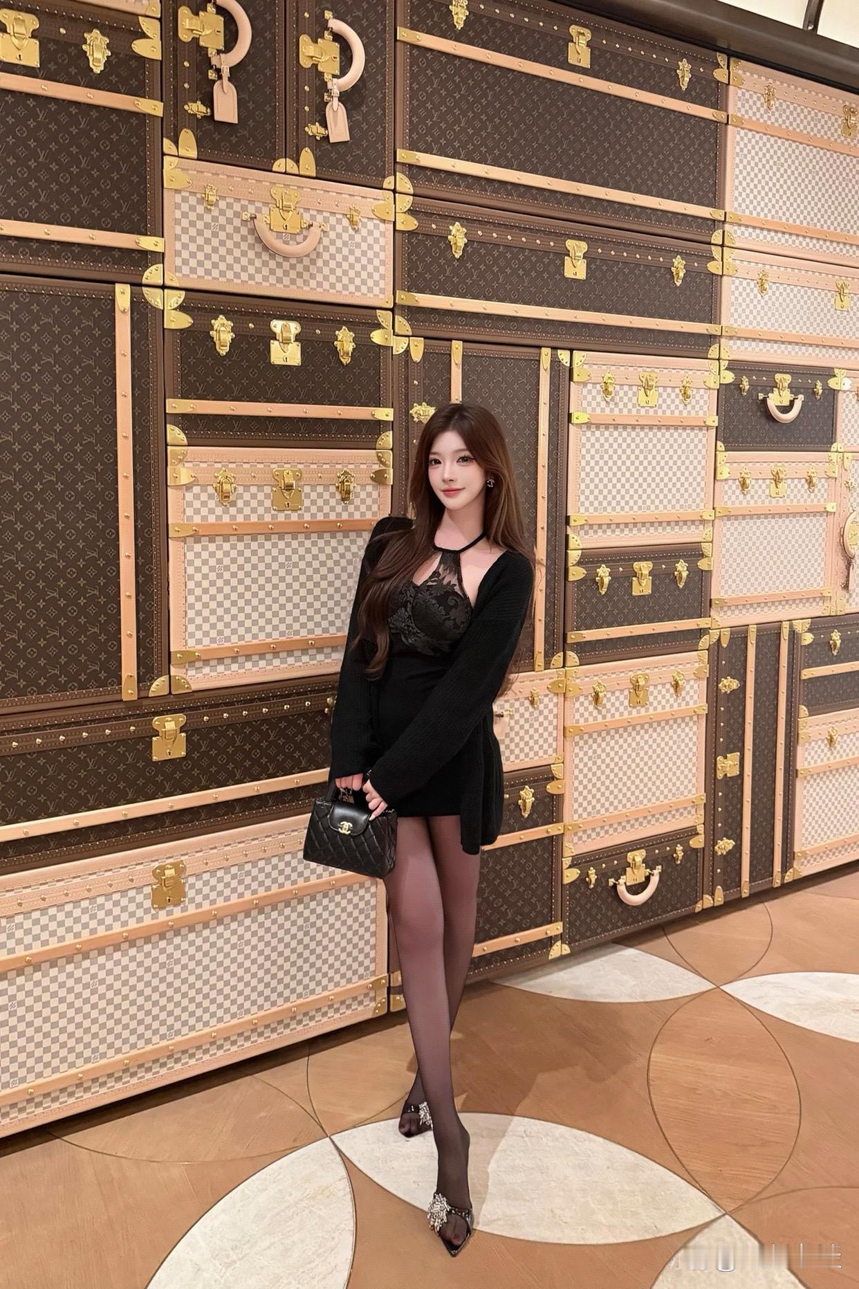 性感~[爱慕][爱慕][爱慕] 她身着一袭黑色蕾丝挂脖连衣裙,蕾丝元素增添了精致与性感,挂脖设计则凸显出优美的肩颈线条。搭配黑色丝袜,与连衣裙色调统一,更显腿部修长。脚上是带有闪亮装饰的黑色高跟鞋,为整体造型增添了华丽感与时尚度。外搭一件黑色开衫,在提升造型层次感的同时,也多了几分优雅气质,手持的黑色包包与整体穿搭相呼应,整体造型既性感又优雅,尽显好身材与时尚品味。如何穿搭出满满高级感?