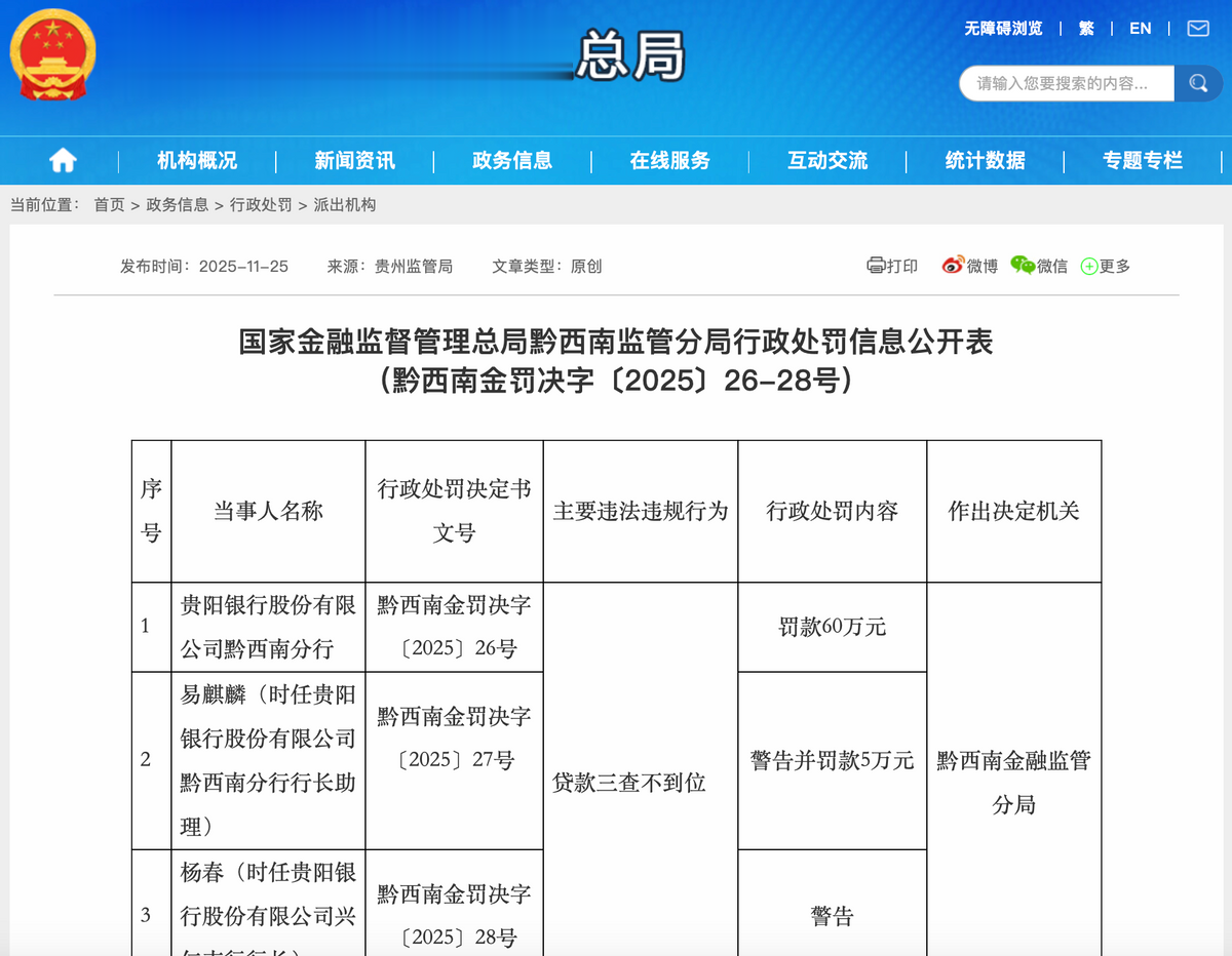 11月25日,国家金融监督管理总局黔西南监管分局行政处罚信息公开表显示,贵阳银行黔西南分行,因贷款三查不到位,被罚款60万元。