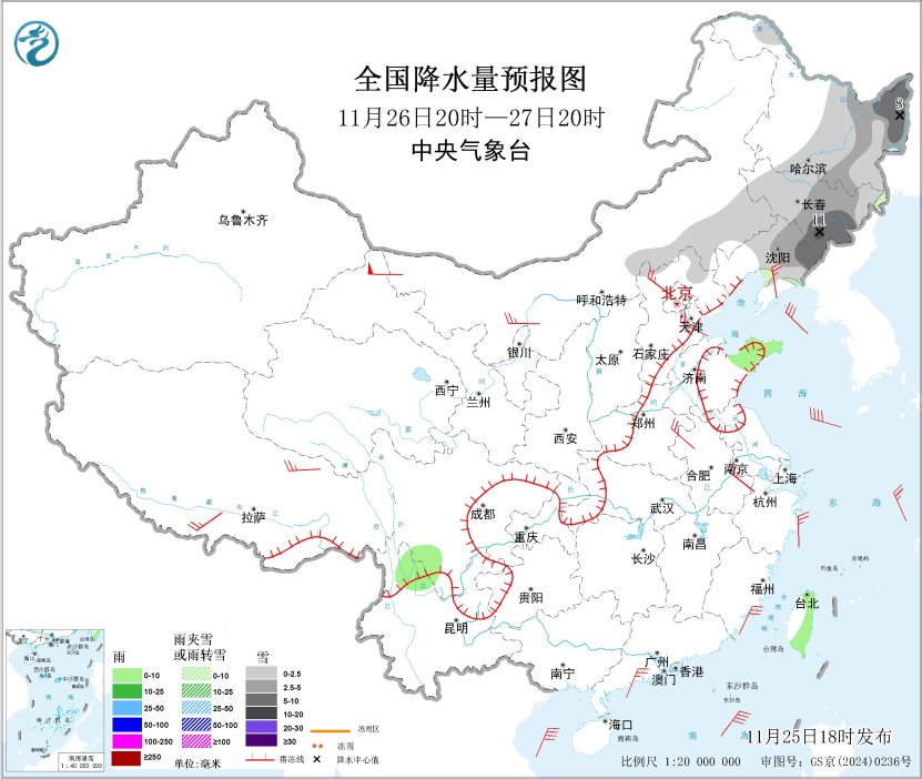 11月25日20时至26日20时,内蒙古大部、西北地区中北部、华北北部、黑龙江北部、西藏东部、川西高原中部等地部分地区有小到中雪或雨夹雪,局地大雪(5~9毫米)。西藏东南部、四川南部、云南北部等地部分地区有小雨,局地有中雨。新疆东部、内蒙古中西部、甘肃、青海东部、宁夏、陕西中北部、山西、河北西北部和中南部、河南中北部、山东西部以及福建东部沿海、西藏等地的有5~7级大风,阵风8~9级,部分地区风力可达8级,阵风9~11级;南海东部海域将有8~9级、阵风10~11级的大风,台湾海峡、台湾以东洋面、巴士海峡、南海西部海域将有7~8级、阵风9~10级的大风,部分海域风力可达9级、阵风10~11级(见图3)。