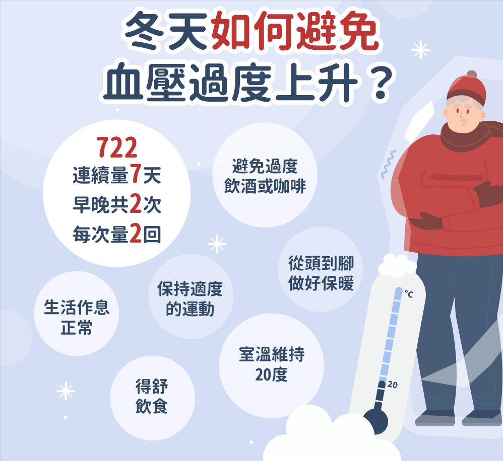 高血压患者如何平稳过冬? 最近气温骤降,门诊血压忽高忽低的患者也多了起来。冬季气温下降,血管收缩,交感神经兴奋,对高血压患者而言如同一场“健康大考”。很多高血压患者会发现,夏天明明控制很好的血压在冬季忽高忽低,大幅增加脑卒中、心肌梗死风险。 首先要保暖。保暖是基础防线,早晨天气冷的时候,晚点出门,气温高一些以后再出门。出门务必备好“护心三件套”——帽子、围巾、手套,重点保护头部和颈部血管,避免受冷引发血压骤升; 第二要规律监测血压变化。可以每天早中晚各测一次血压,记录测量的时间点和具体血压值。需要注意的是,测量之前要安静休息 15 分钟以后再测量才准确。规律测量血压不仅能够尽早发现血压变动,还能更好了解自身血压变化的趋势和规律,以便更好调整治疗方案。 第三要保证充足睡眠,避免熬夜和情绪激动。选择可以在室内进行的运动,比如打太极拳、慢走等等,既能活动身体,又能避免寒冷刺激。
