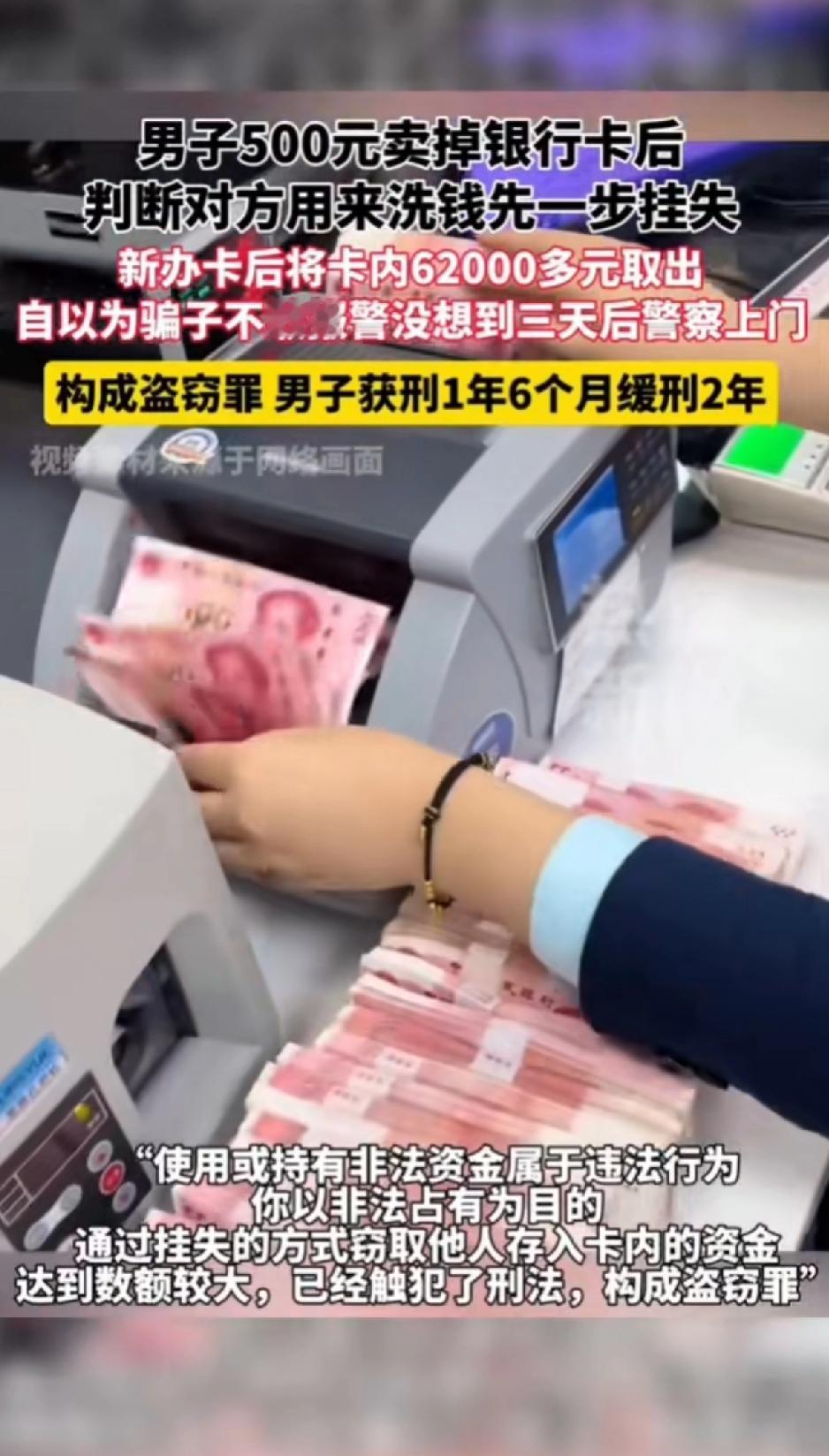男子500元卖掉银行卡,判断对方用来洗钱先一步挂失,新办卡后将卡内62000多元