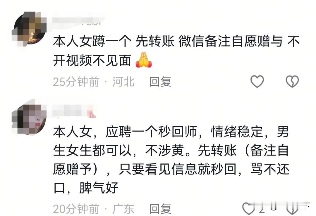 新骗局又来了,无意间在抖音上刷到一个职业叫挨骂师,意思就是让别人骂你,对方付钱,看他们转账的金额都不小,不少人看了都心动了吧,打开评论区一看,全是什么要应聘的,有说单多要招人挨骂的,这一看妥妥的就是广告引流啊,哪有这么好赚的钱。 不过已经有好奇的网友去趟雷了,网友说加上他们的联系方式后,他们就说没有单了,然后就给推销几千块的剪辑课,让你交钱上课,还有的说要交押金,交钱后就给你派单,反正全是骗人的。 所以要找兼职的朋友还是在线下做吧,至少靠谱一点,网上真的很不靠谱,真那么赚钱别人还会告诉你,醒醒吧[笑哭][笑哭]