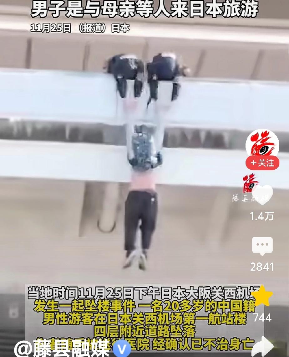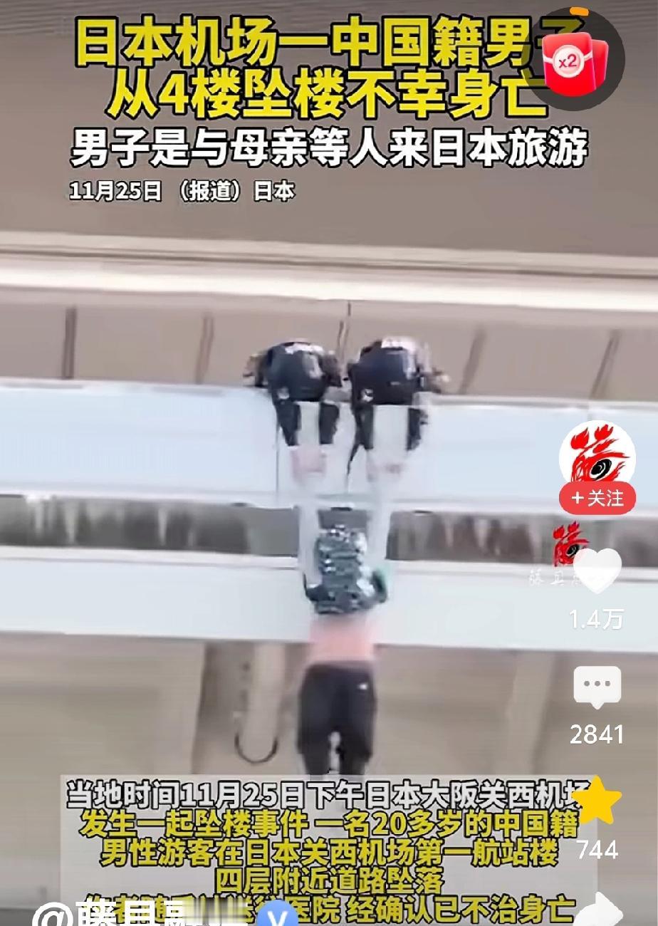 都说了,有危险!有危险!近期不要去日本,可有人就是不听。 好好在国内待着不行吗?尤其在这中日关系紧张时刻。并且我国外交部已经告知,国人非必要不要前去日本。为什么有些人就是不听呢? 25日,一名20岁中国籍男子,在日本大阪关西机场四楼坠落身亡。 最近两天,日本机场排队回国的华人多的堪比我国的春运。最近,由于高市早苗的挑衅,中日关系一度紧张,航班都取消了12条,并且,国家一再提醒,不要去日本旅游,可总是有人反其道而行之。 据说,坠楼者就是和母亲一起去日本旅游去了,当时,不知道为什么,该男子身体挂在航站附近的护栏上,当警察前去救助时,不慎从高空坠落。两名警察都没有把他给拽上去,好可惜! 不听话的人,在人家的地盘上出了事,你说赖谁? 图片来自网络,侵删致歉!