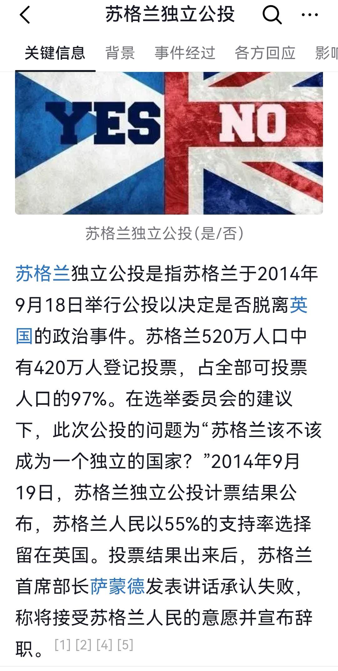 我说过很多遍了,台湾问题,不能和其他国家的地方独立相提并论,没有可比性,你要比较,就会掉坑里去。英国是允许苏格兰独立公投的,并且也进行了独立公投,但是没有通过。美国加州从纽森州长和州务卿都积极推动加州独立公投,并且还在推动这个工作。中国台湾问题的逻辑,和国外这些国家是不一样的,傻子们不懂逻辑!