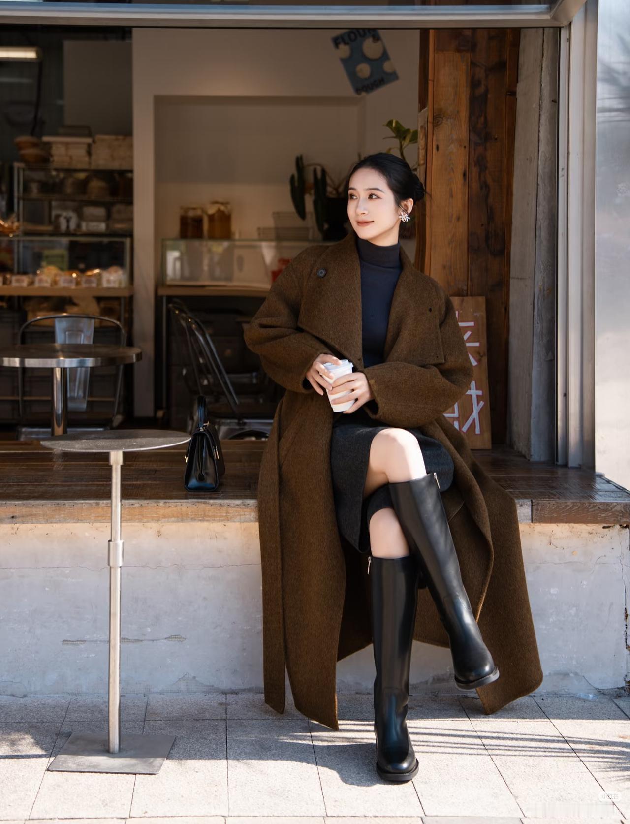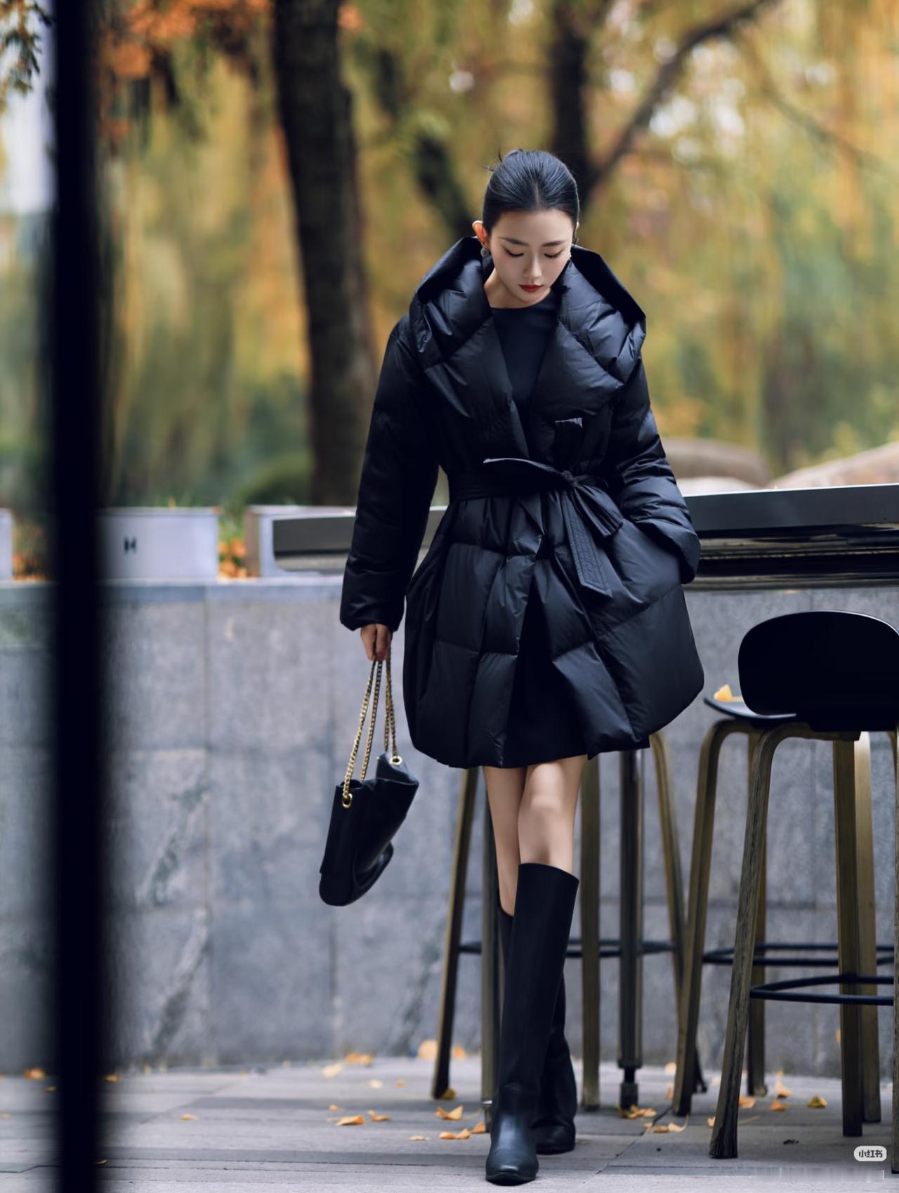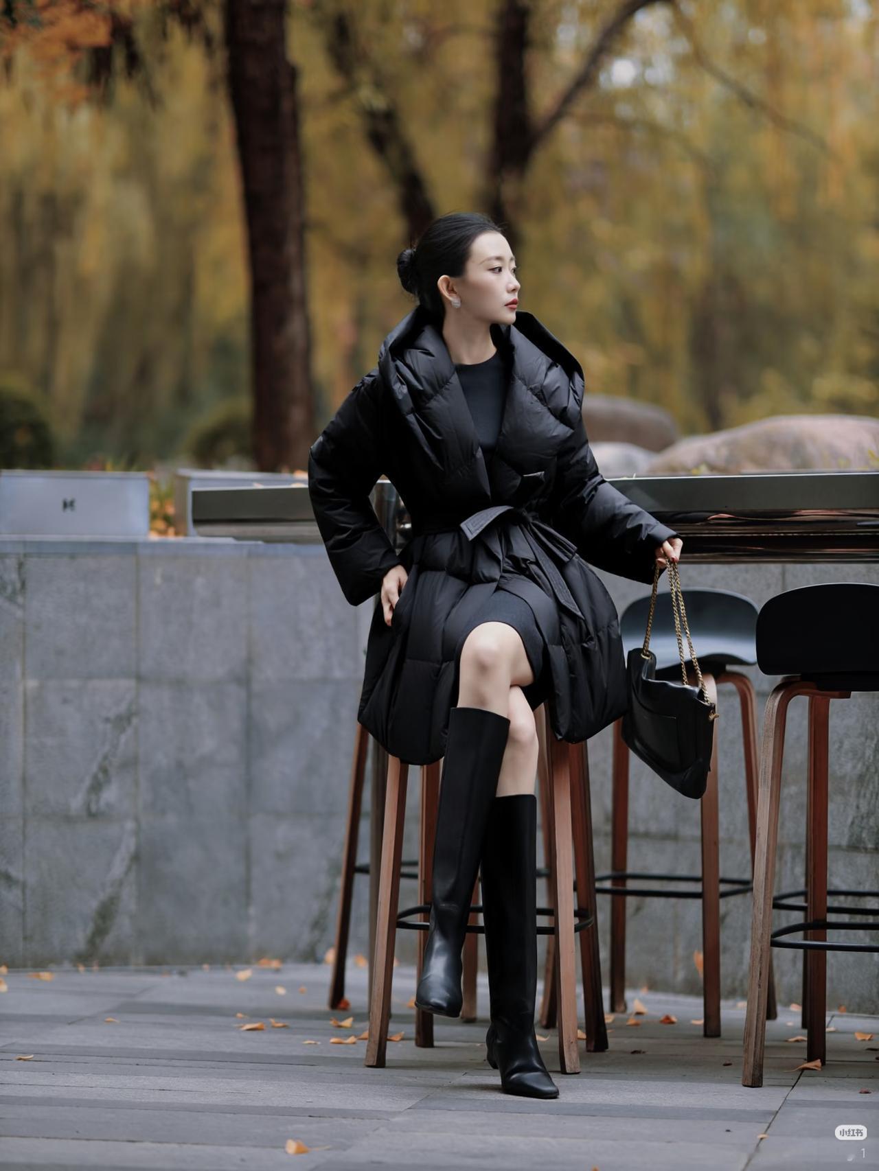 比如膝下靴,搭配长度在大腿中部的中长棉服和大衣,露出部分大腿和膝盖,保暖好看不失