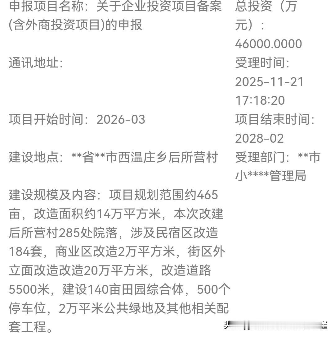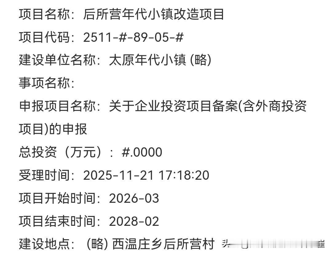 2025.11.25【太原市后所营年代小镇改造项目】太原市后所营年代小镇改造项目,该项目位于山西省太原市西温庄乡后所营村,规划范围约465亩,改造面积约14万平方米,本次改建后所营村285处院落,涉及民宿区改造184套,商业区改造2万平方米,街区外立面改造改造20万平方米,改造道路5500米,建设140亩田园综合体,500个停车位,2万平米公共绿地及其他相关配套工程。