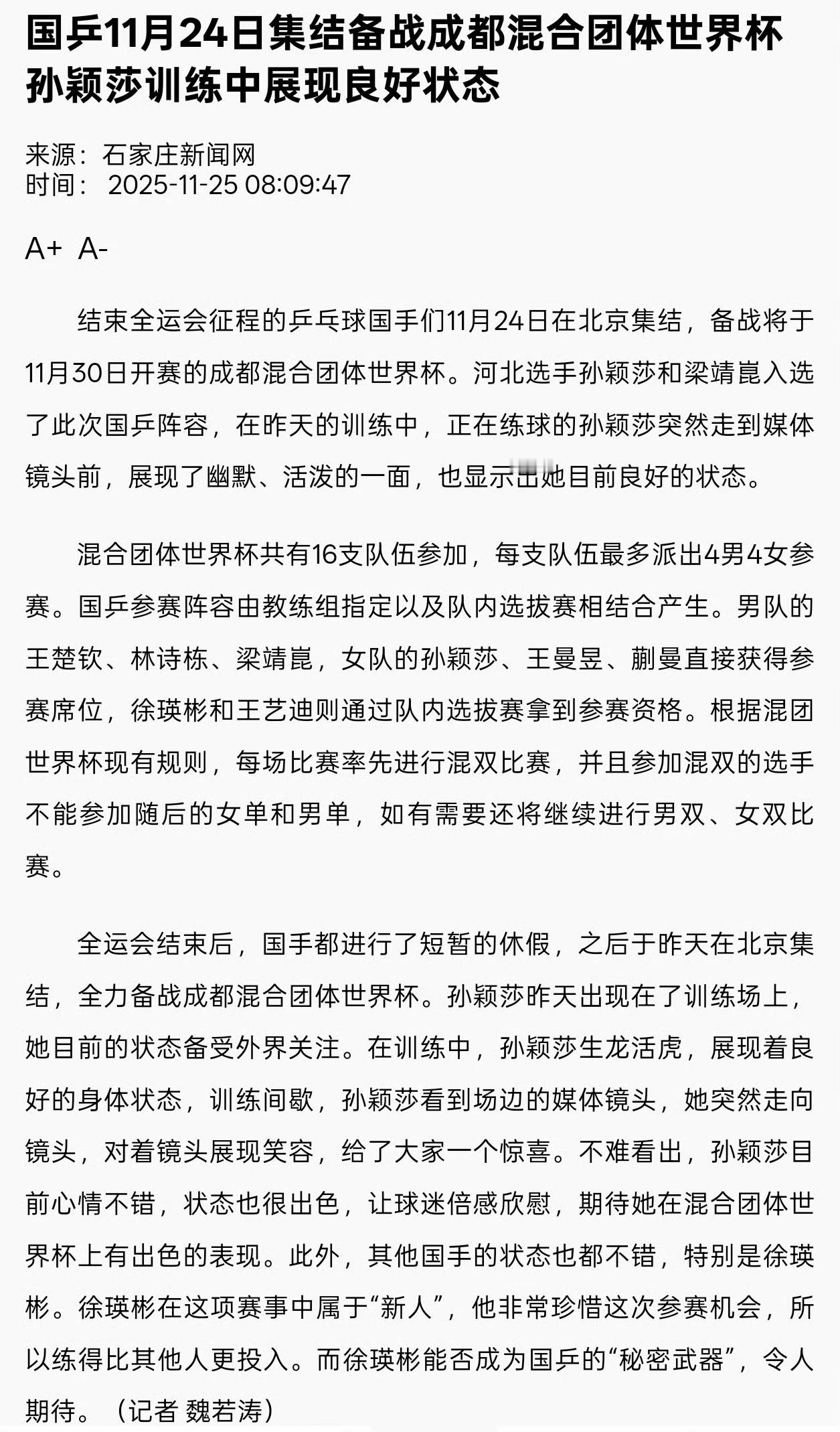 “生龙活虎”“展现笑容”“心情不错”“状态出色”期待混团中的孙颖莎