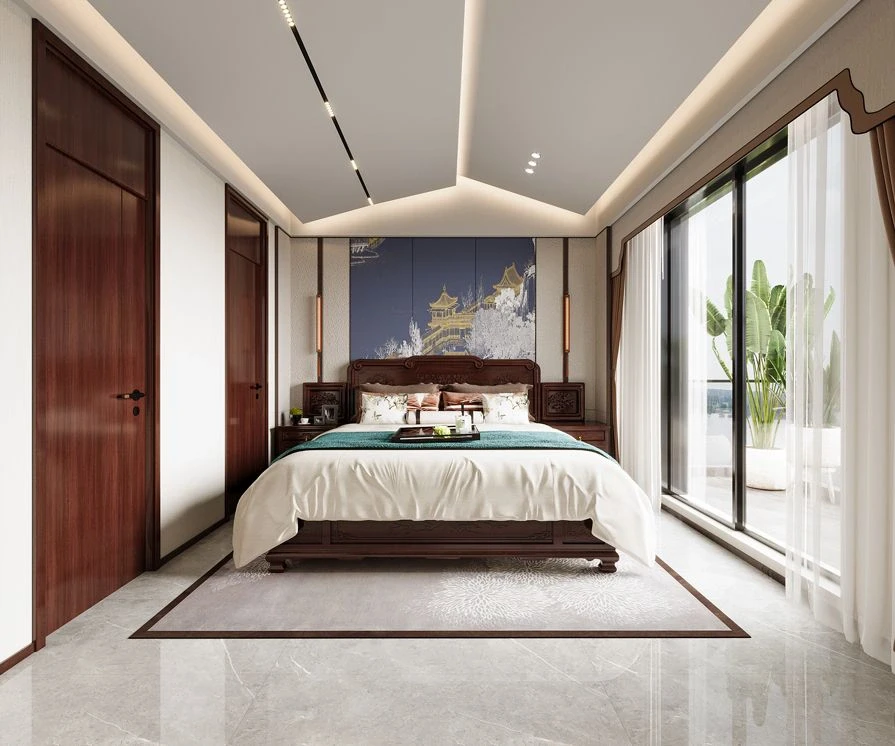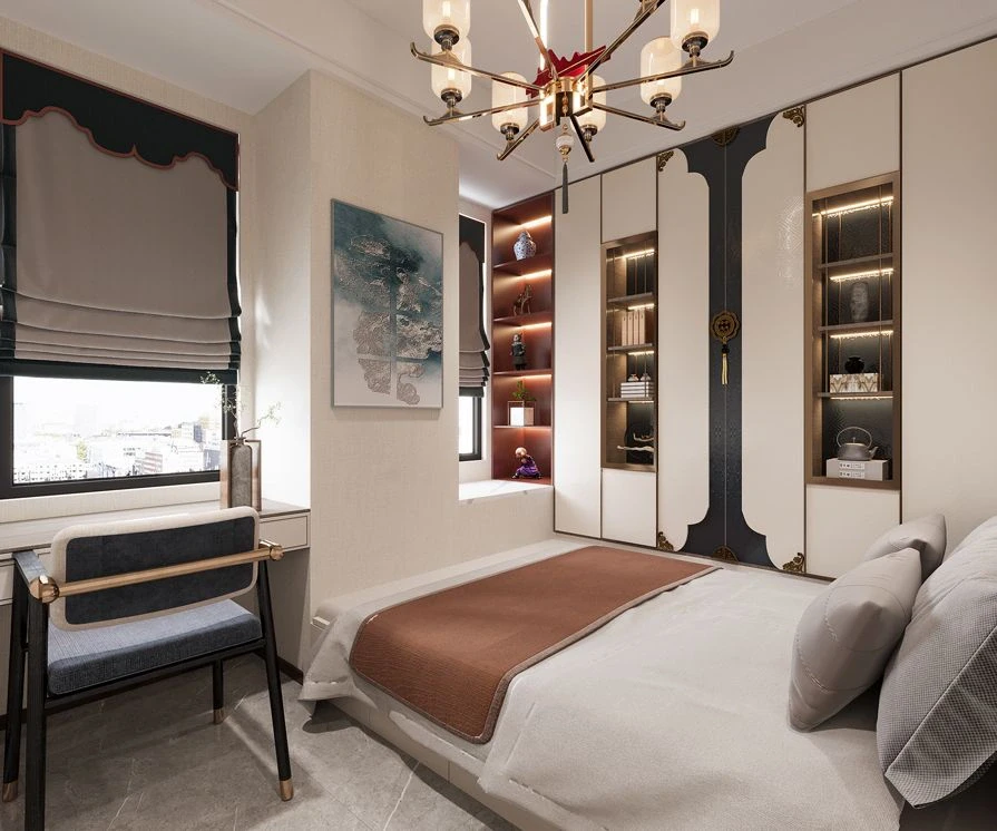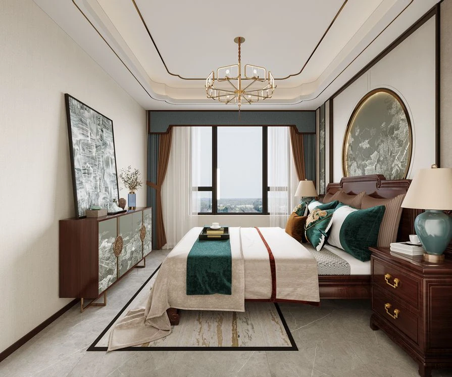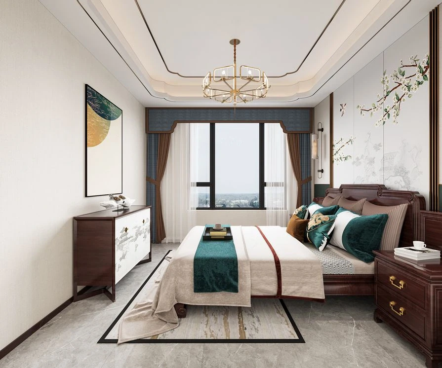 ❣️次卧客卧延续了整个空间的典雅气息,依旧是厚实的红木储物柜与床头柜,背景墙是不同的能够展现古典文化的山水风景画,在中式古典的基础上多了一份现代风格的简约,有一种细腻的文化气息。