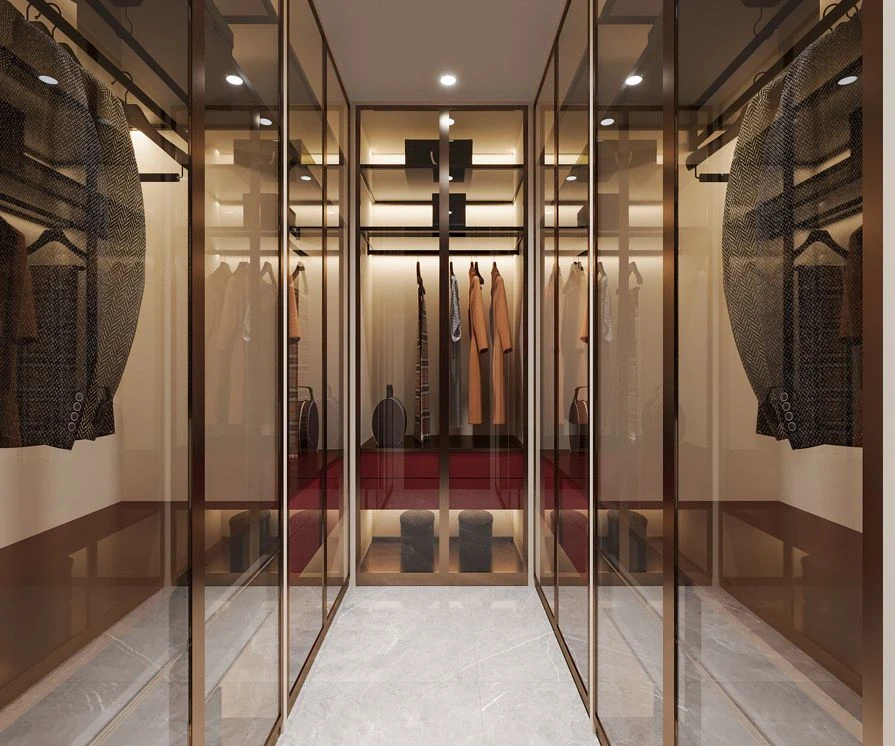 ❣️富裕的空间在主卧做了衣帽间,玻璃门的设计使整个空间从外观上来看更加的高端、大气一些。玻璃材质本身就具备的反光效果,在视觉上还可以给人一种扩增面积的效果。