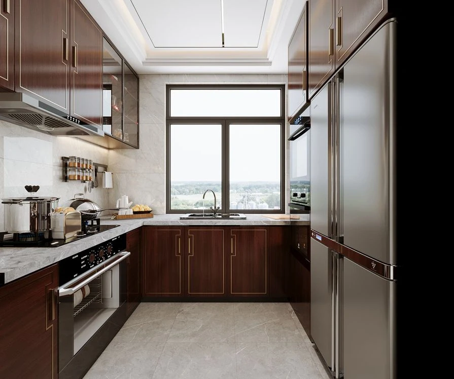 ❣️厨房使用的依旧是与整个空间相对应的深色,L型的设计使厨房整体看起来非常整洁,动线布局也很合理。内嵌式冰箱即美观又节省了不少空间。