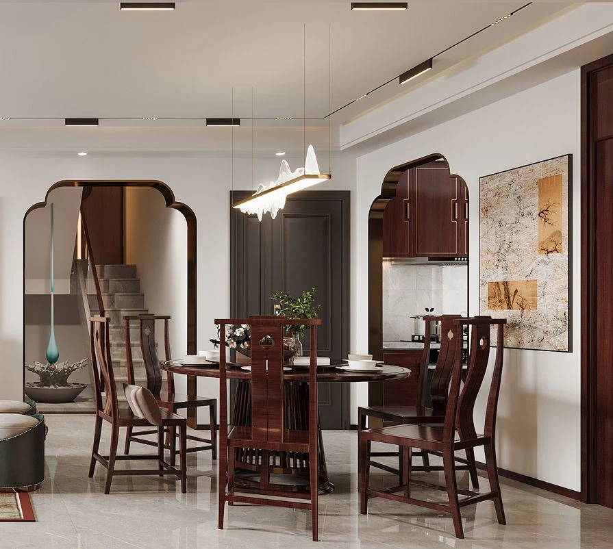 ❣️餐厅依旧是红木餐桌+餐椅,搭配着山水画吊灯厚重又大气。中国家庭的餐厅是家人们团聚交流情感的地方,而圆桌不仅符合中国人大家“围坐”的饮食习惯,也蕴含着"团圆"之意。