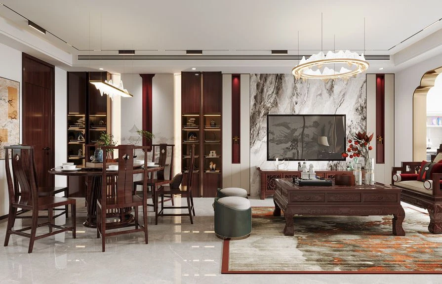 ❣️整个空间简约典雅,以秀丽的山水画实木护墙板作为背景墙,厚重的红木沙发+茶几搭配上山水画圆环吊灯,高级大气。