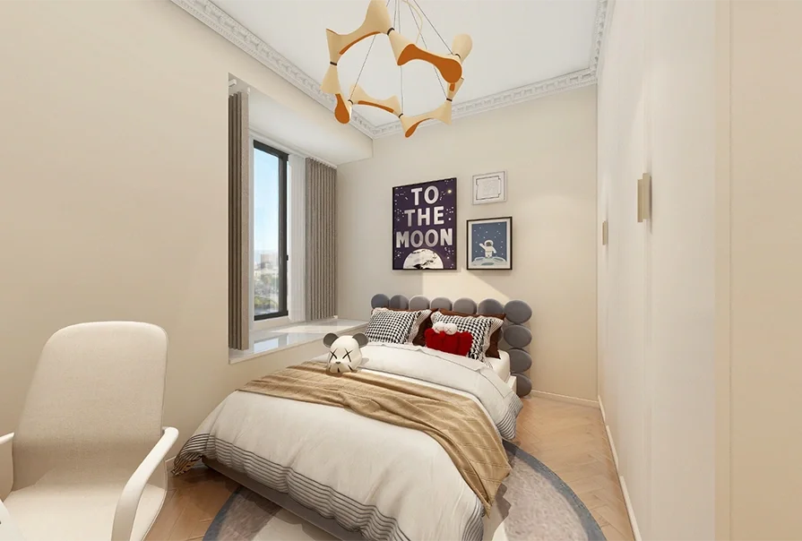 🌿次卧延续了主卧的风格,依旧是与整个空间主基调相同的配色+储物能力满分的的通顶衣柜,不失为另一个舒适的休息空间~