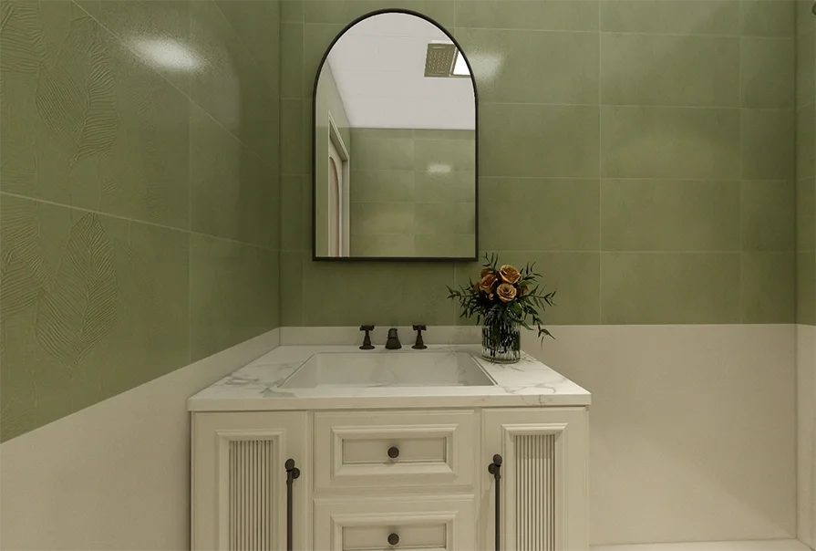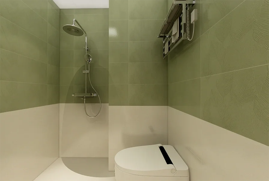 🌿干湿分离的卫生间方便清洁打理,墙面采用了绿色+奶油色的颜色搭配,电视背景墙 整个空间明亮又通透,清新的绿色使人放松。