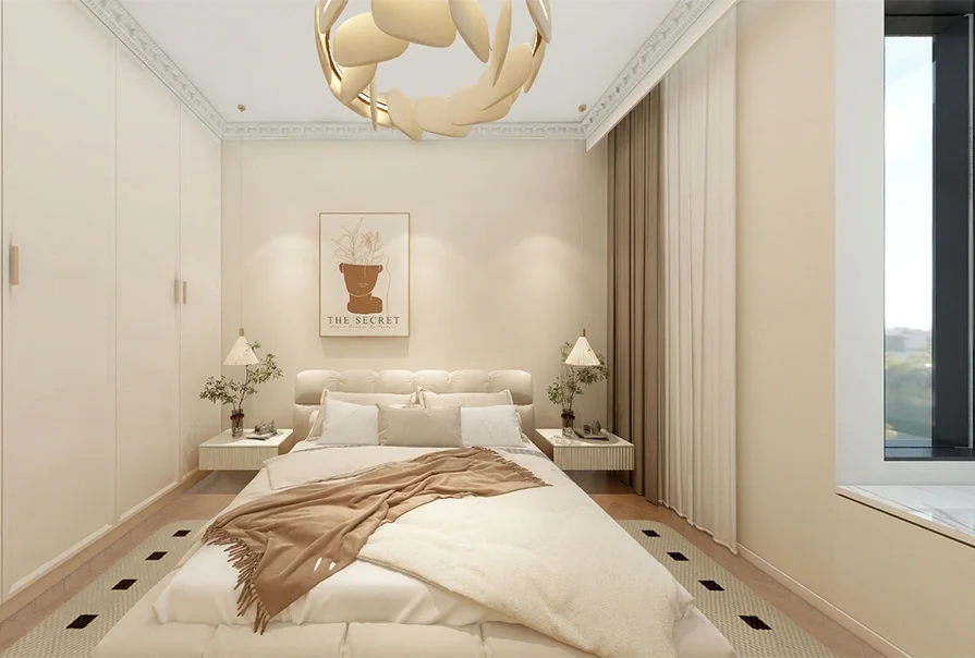 🌿干净整洁的奶油配色,卧室并没有什么复杂的设计,定制的床头柜、通顶衣柜美观又具有极高的实用性,床边点缀的绿植自然活泼,与客厅相同的是同样铺了一张法式地毯,柔软高级。