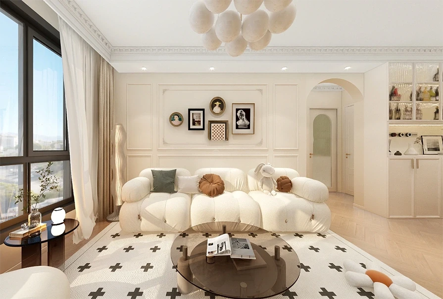 🌿沙发背景墙与电视背景墙做同样的设计,挂上具有别样风情的复古装饰画,艺术气息拉满。奶油风科技布豆腐块小沙发+透明玻璃茶几搭配上创意魔豆泡泡吊灯,同时地面铺了法式地毯作为空间的隔断处理,满满的摩登高级感。