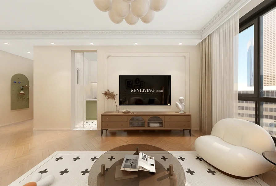 🌿电视背景墙整铺奶油色乳胶漆,选择了比较简约的石膏线边框设计,颜色与墙面刷成同样的颜色,十分精致。