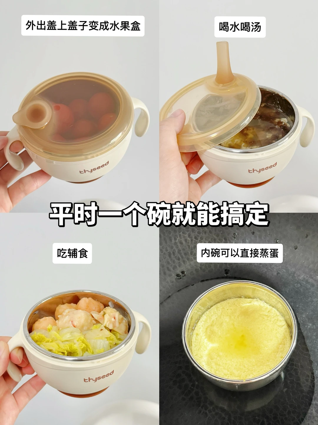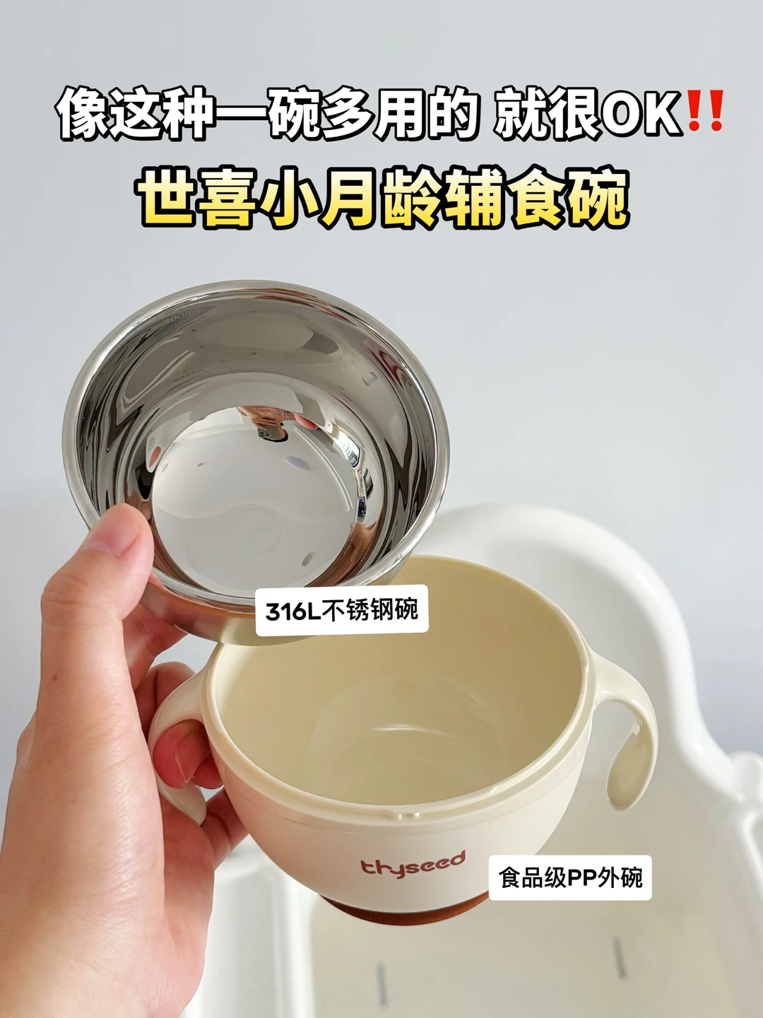 🔹有内外碗、带吸盘、带盖子、带吸管的辅食碗更实用,用到孩子上幼儿园都没问题!参考👉世喜小月龄辅食碗,它就是内外碗组合的,内碗是316L不锈钢材质,平时直接上锅蒸蛋都没问题,外碗是食品级PP材质,装水果吃也很放心!