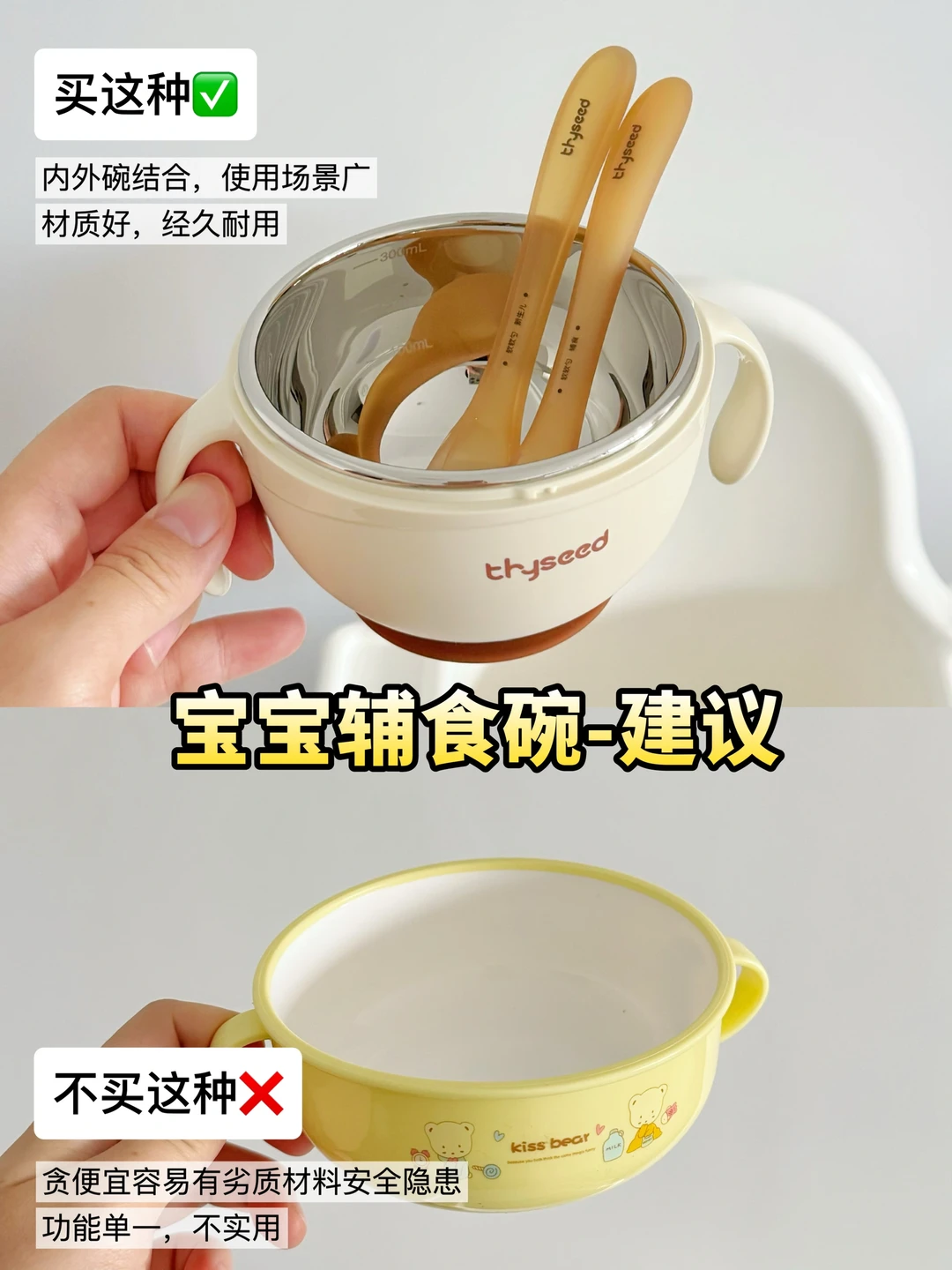 ▪️辅食碗:装宝宝的食物,涉及到入口,材质一定要安全,如果是金属材质,选316L不锈钢材质✔️,如果是塑料的,则选食品级PP材质的!