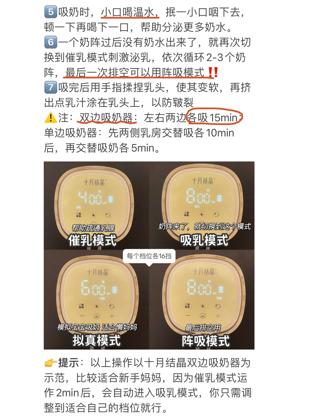 🔹注:每个吸奶器的模式档位不尽相同,以上我是根据自用的十月结晶双边吸奶器P3 pro+来解说的,新手妈妈可自行参考。它是智能变频4种模式的,每个模式都有16个档位,因为档位多,所以增减很柔和,下一档的力度不会和上一档的相差过大,你能很轻松的找到自己舒适的力度,很适合不同乳腺敏感妈妈,因为这个,十月结晶还获得了IDA国际设计奖,使用起来很人性化。而且可以单双边切换,无论什么情况都能满足我的需求。