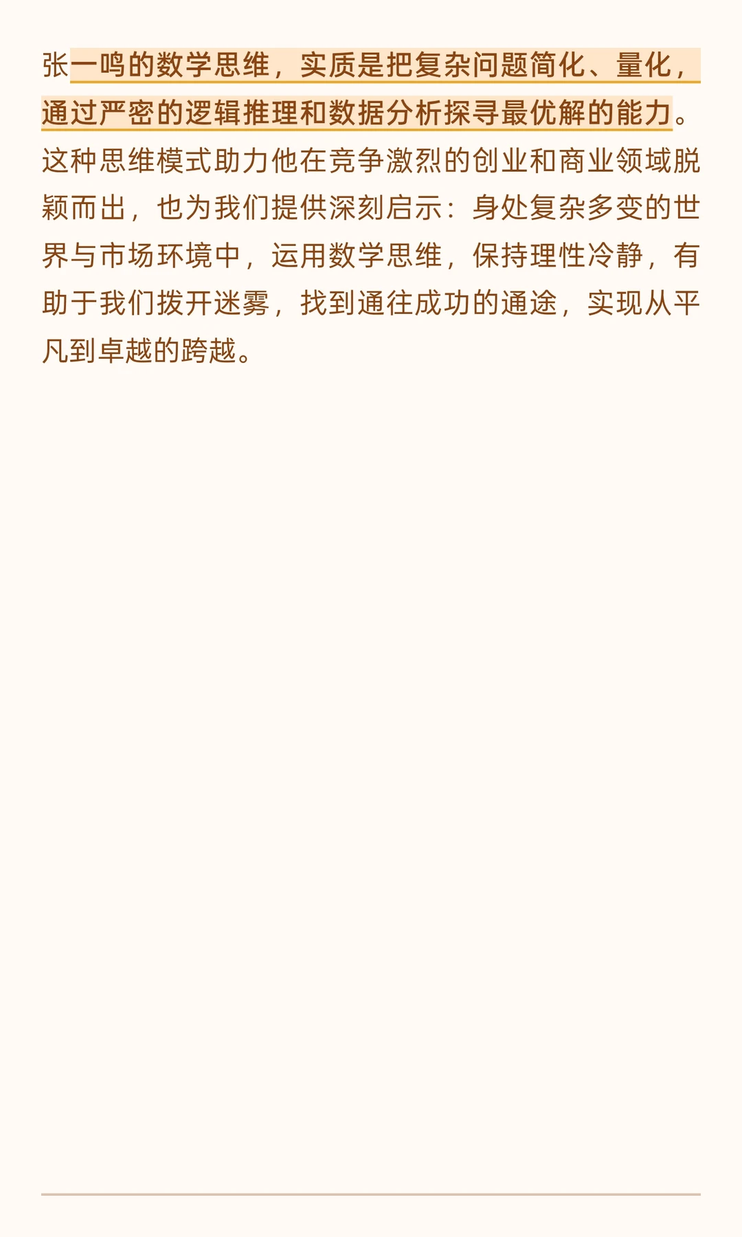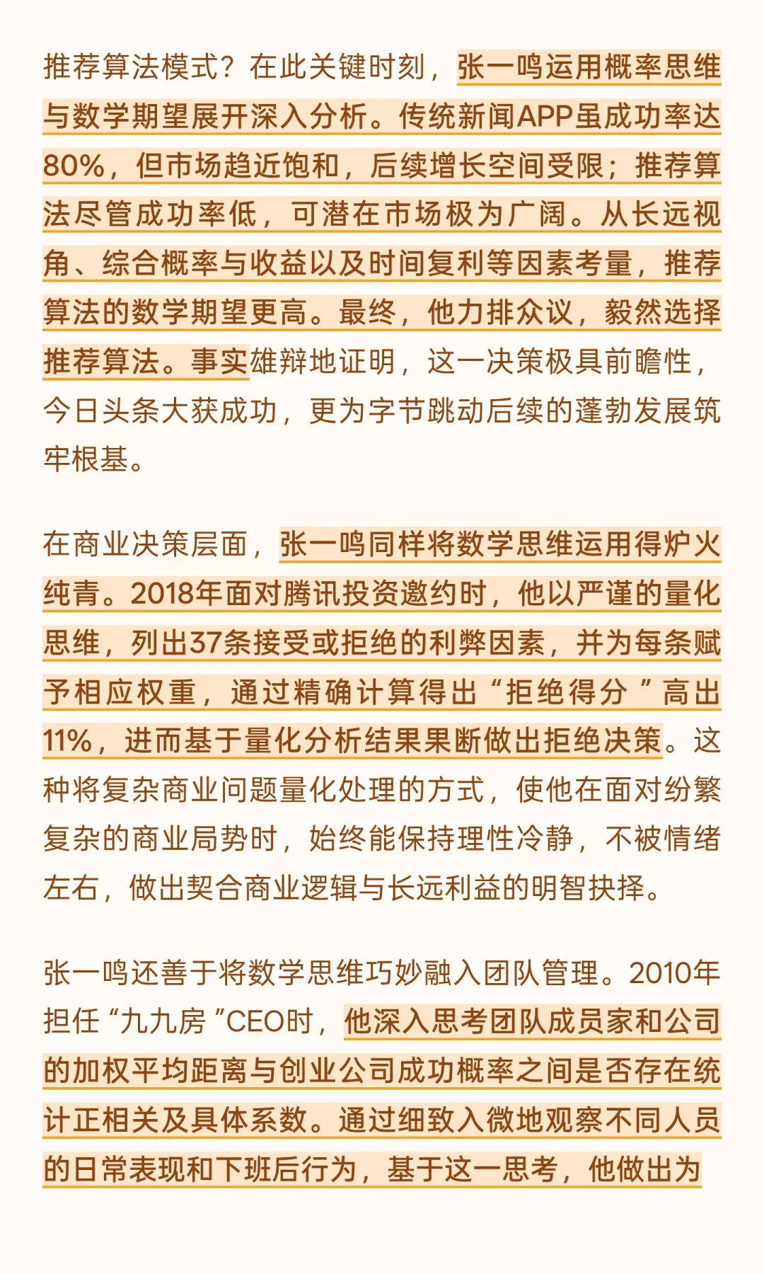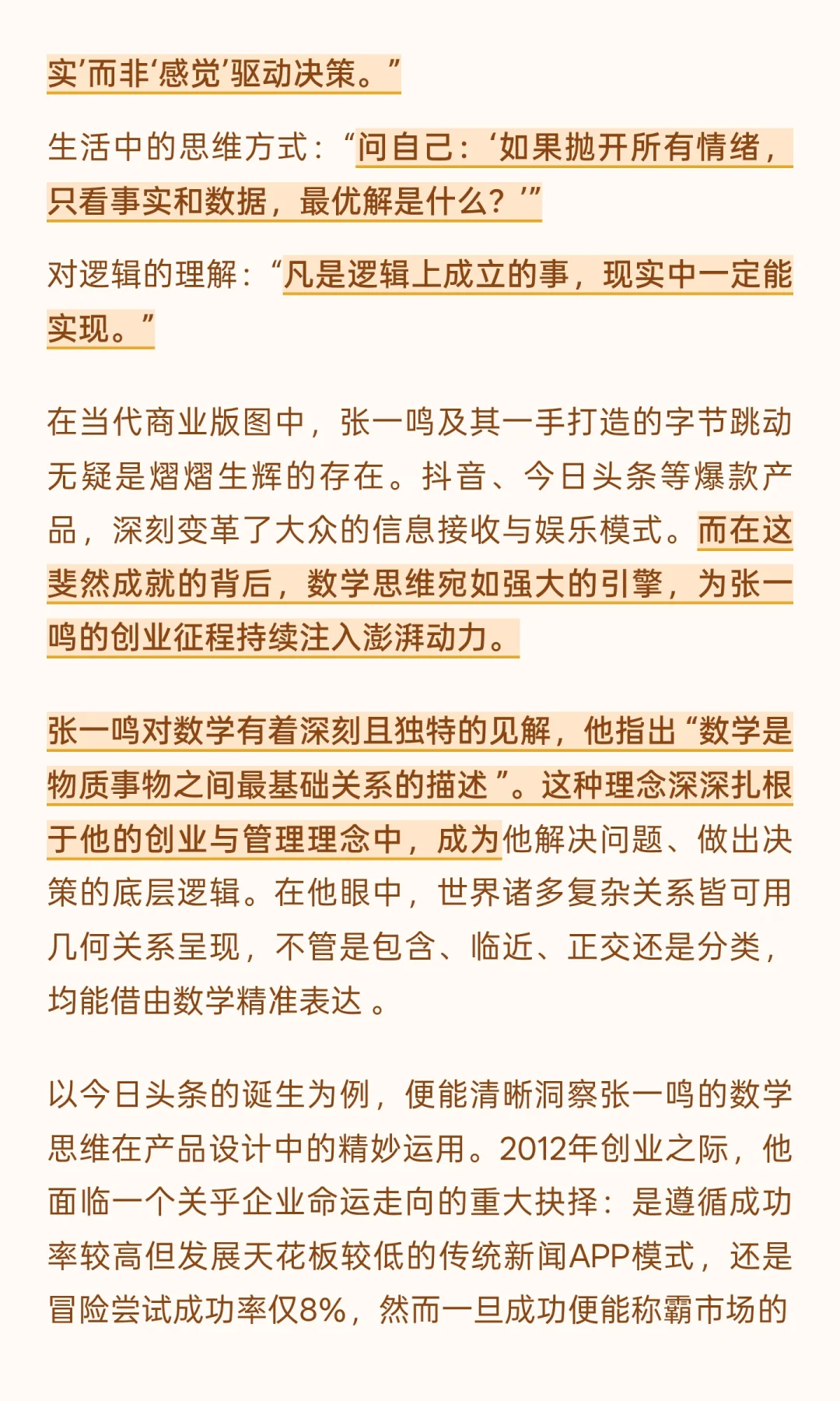 张一鸣通过数学思维指导创业决策,从今日头条推荐算法到腾讯投资拒绝,精准量化分析,确保决策最优。他将数学融入产品设计、团队管理、日常生活,保持理性冷静,推动字节跳动快速发展。