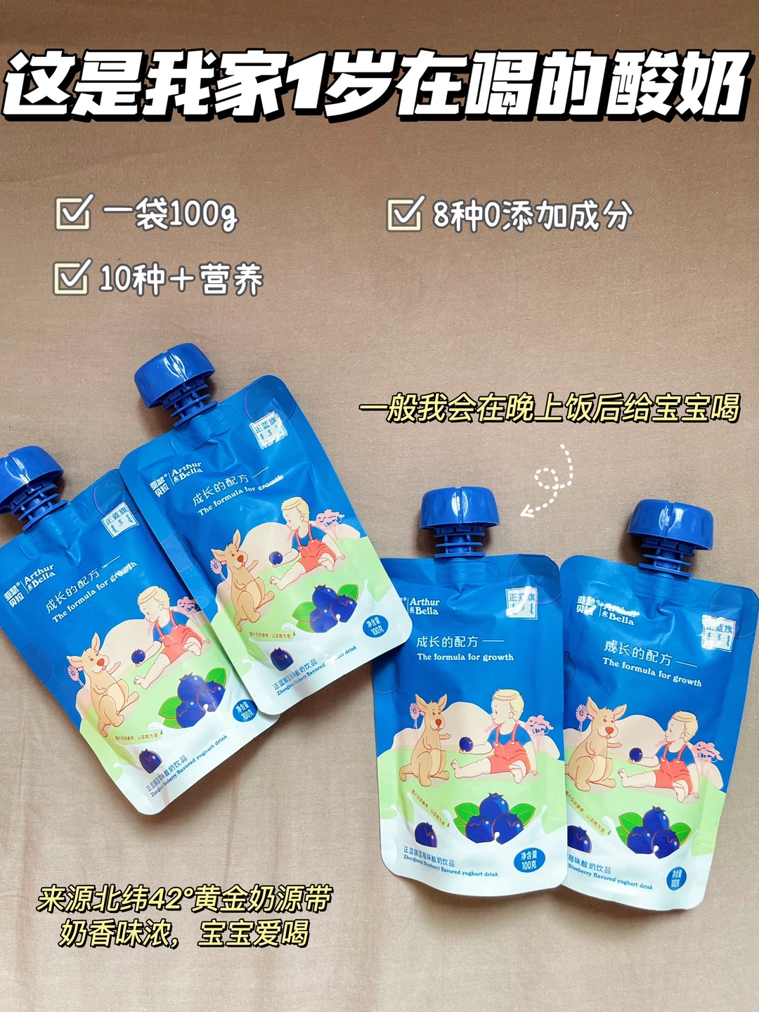 🔹提示:如果新手妈妈还是不知道怎么选的话,可以试试👉亚瑟贝拉酸奶,以上标准它都符合,来自北纬42°的黄金奶源带,不含白砂糖、香精、色素等8种0添加成分,但奶味十足,喝起来口感浓稠。而且含14种强化营养,很适合作为宝宝第一口酸奶。我家宝宝最喜欢蓝莓味,口感丝滑浓郁~