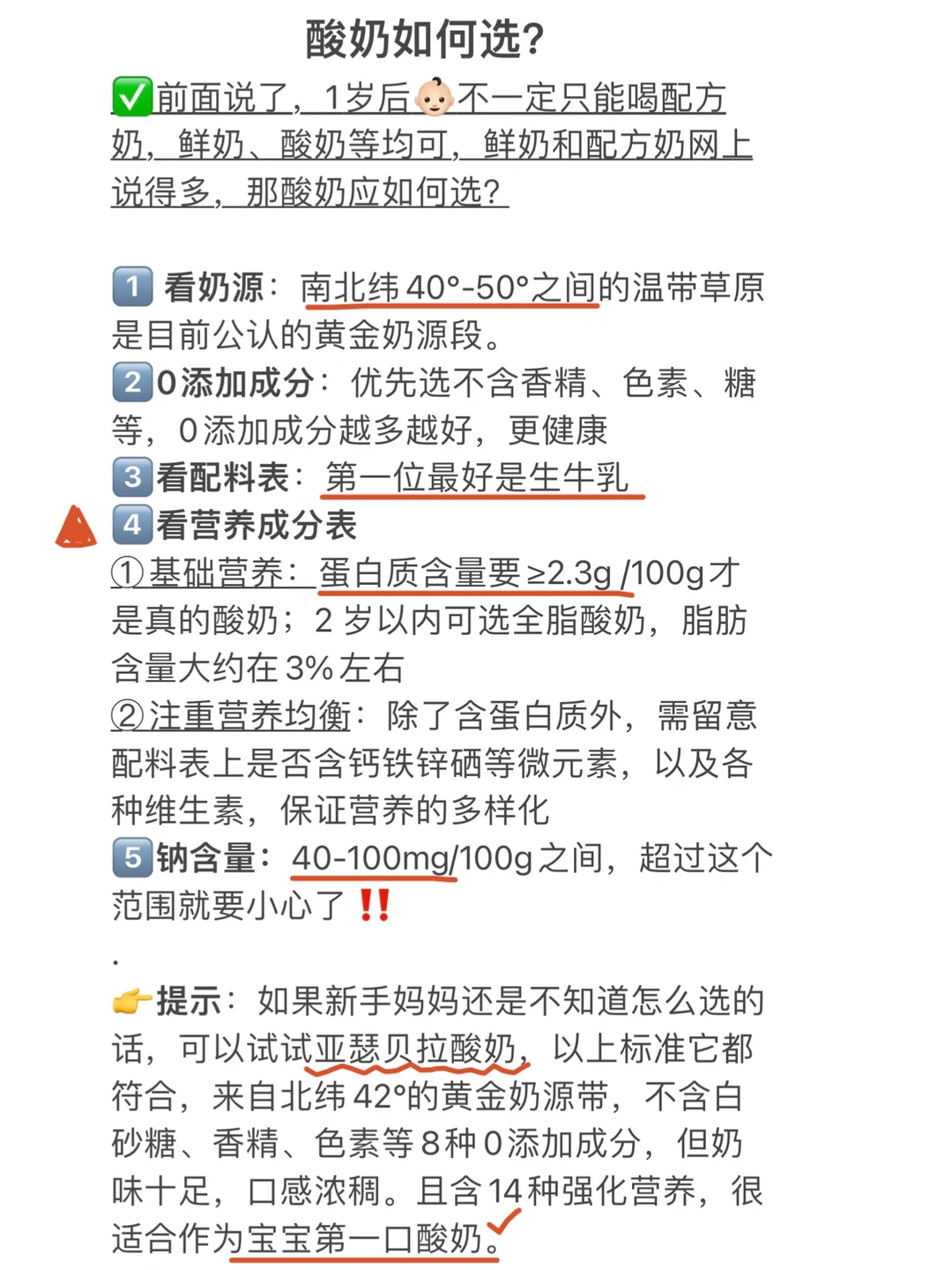 ⚠重要提示:很多妈妈不知道,一岁以上,其实宝宝不一定只能喝奶粉了,可以是牛奶、羊奶、酸奶等不同性状的乳制品,这个时候喝奶主要目的是补钙、增强宝宝保护力。然而,牛奶和配方奶网上说得最多。应该如何选酸奶呢⁉️