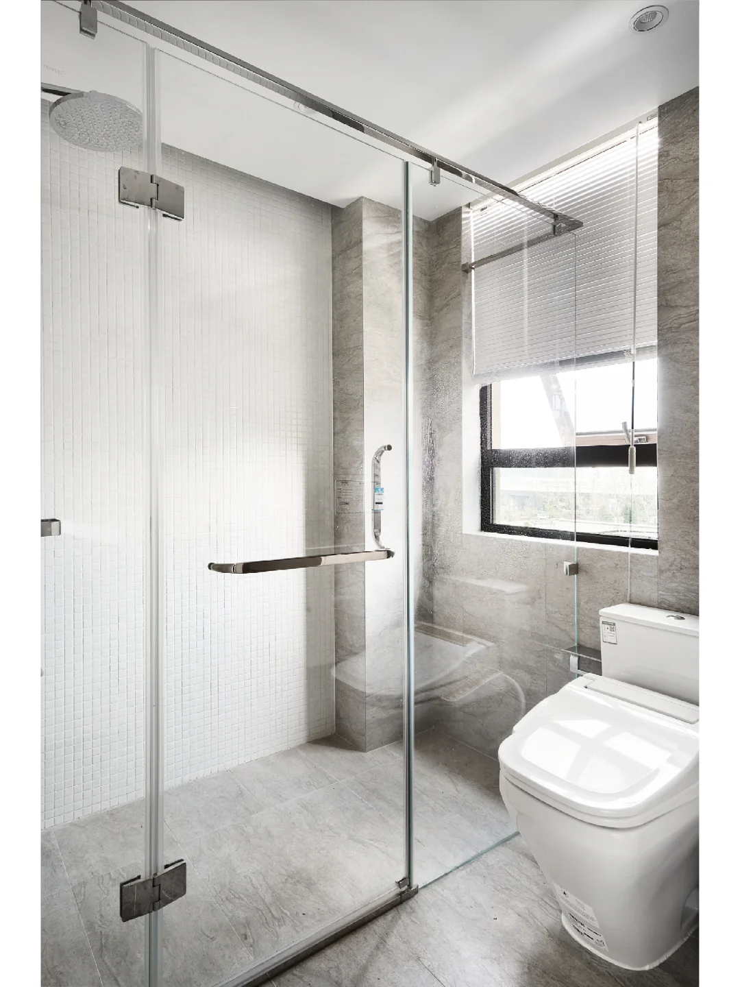 ⭐卫生间以玻璃隔断进行干湿分区,极简设计,更显出空间的简练感来。打造纯白系的空间,不失沉稳大气之美。