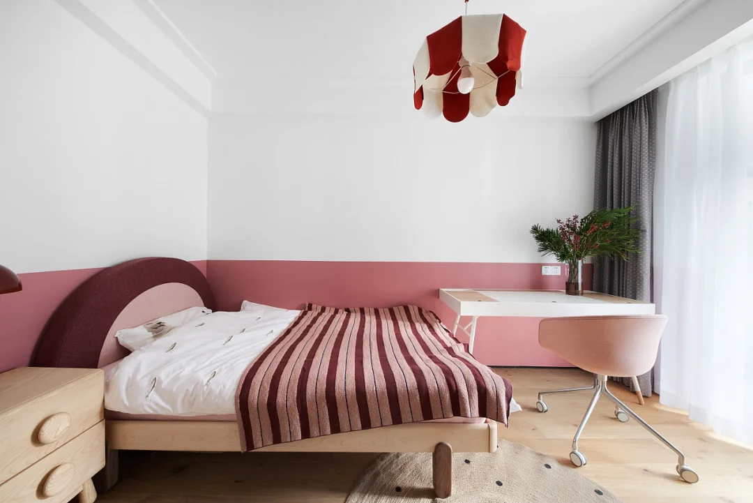 ⭐与整体色调不同的是,次卧采用了鲜艳的红色+粉色,给人眼前一亮的感觉,使得整体的色调不会过于枯燥无味,丰富了视觉效果。