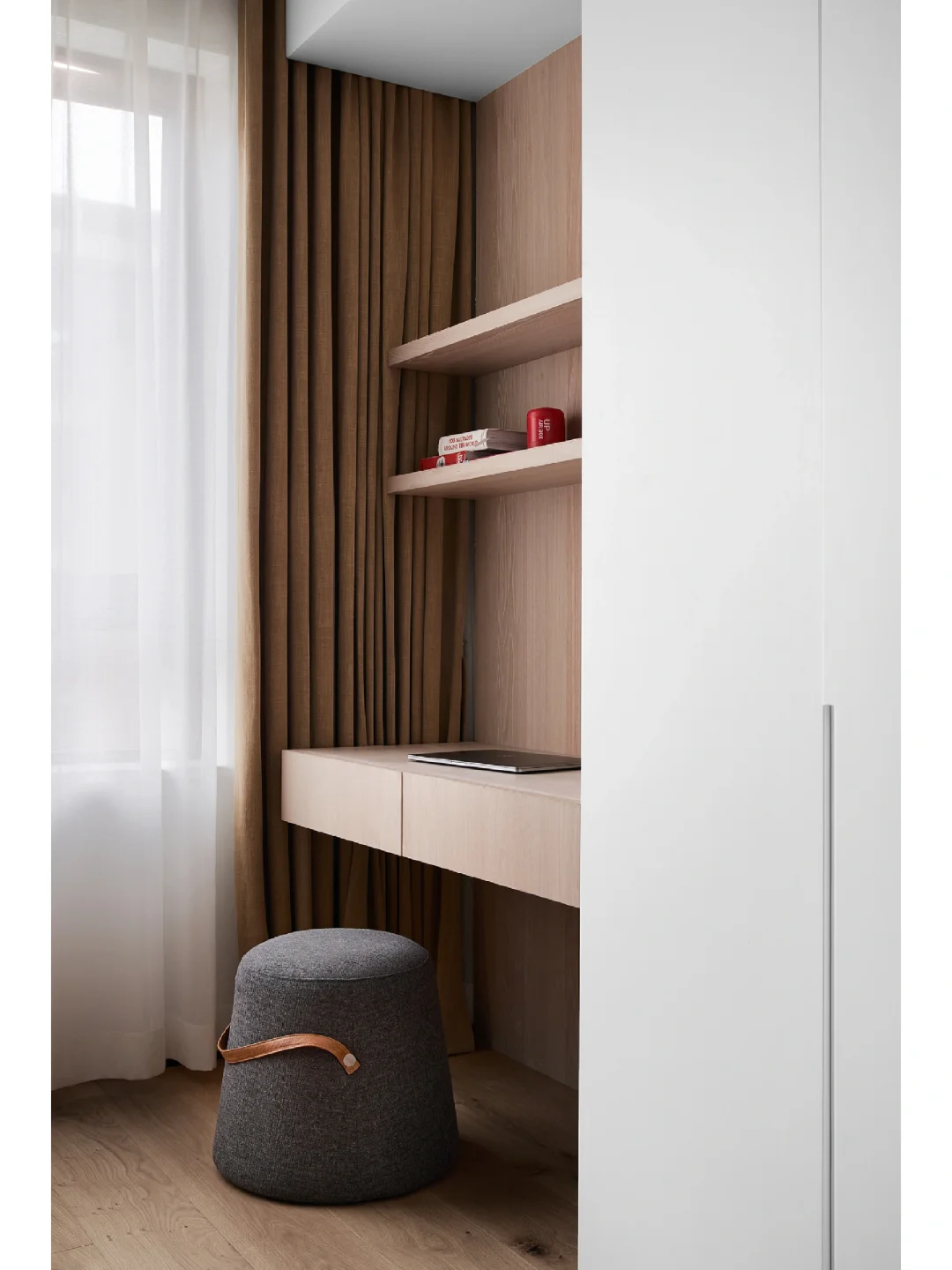 ⭐定制的整体梳妆柜+衣柜,低饱和色调舒适简约,整体线条流畅,很好的满足了日常的收纳需求。
