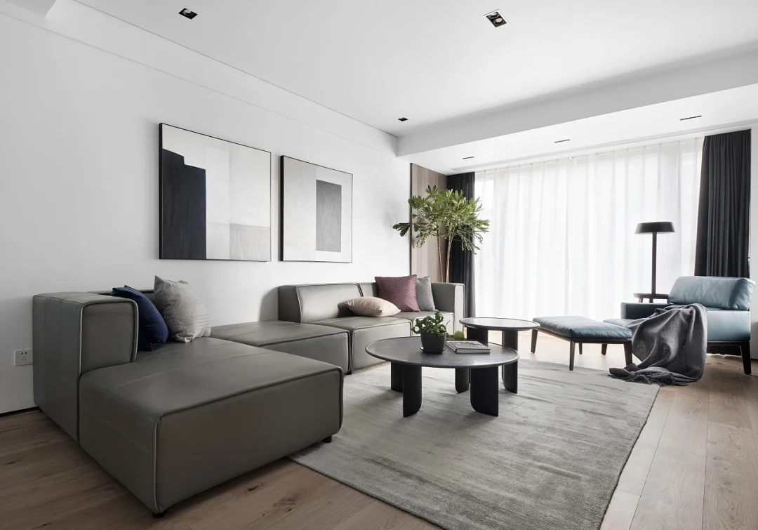 ⭐沙发背景墙铺刷乳胶漆,搭配灰色皮质沙发,丰富空间层次感。大型绿植静矗右侧,绿意在低饱和度的空间内尤为突出。在家具软装上,也遵循删繁就简的理念。简单的圆几稳居中央,搭配蓝色沙发椅,低饱和的配色,不夺人眼球,彰显屋主纯粹高级的审美。