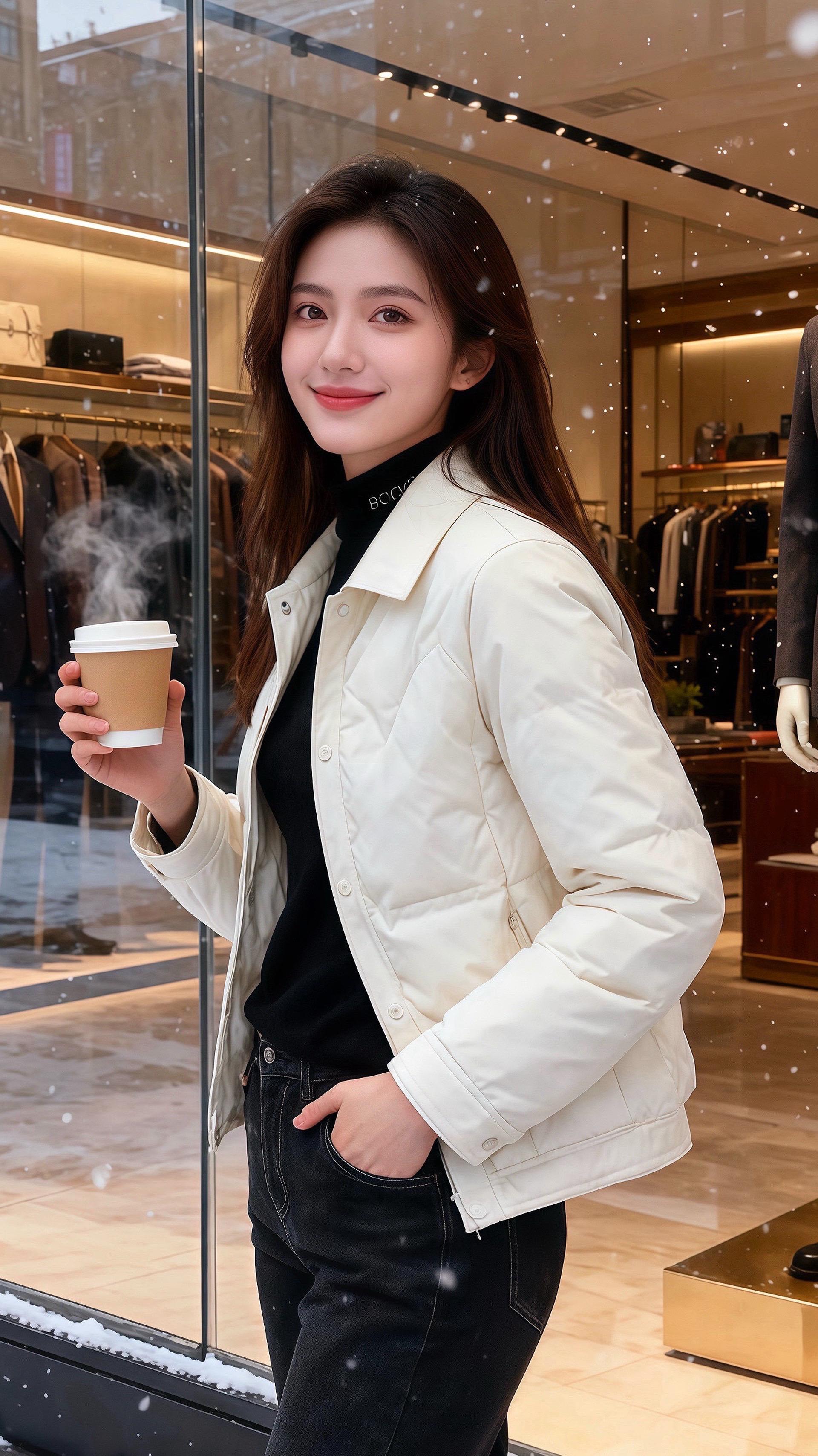 “等久啦?”他拎着纸袋走近,看见她起身时棉服下摆轻晃,像裹了团蓬松的云。黑阔腿裤顺着脚踝垂下来,和高领衫织成低调的呼应,连手里星巴克的白杯都成了搭配里的点睛笔。