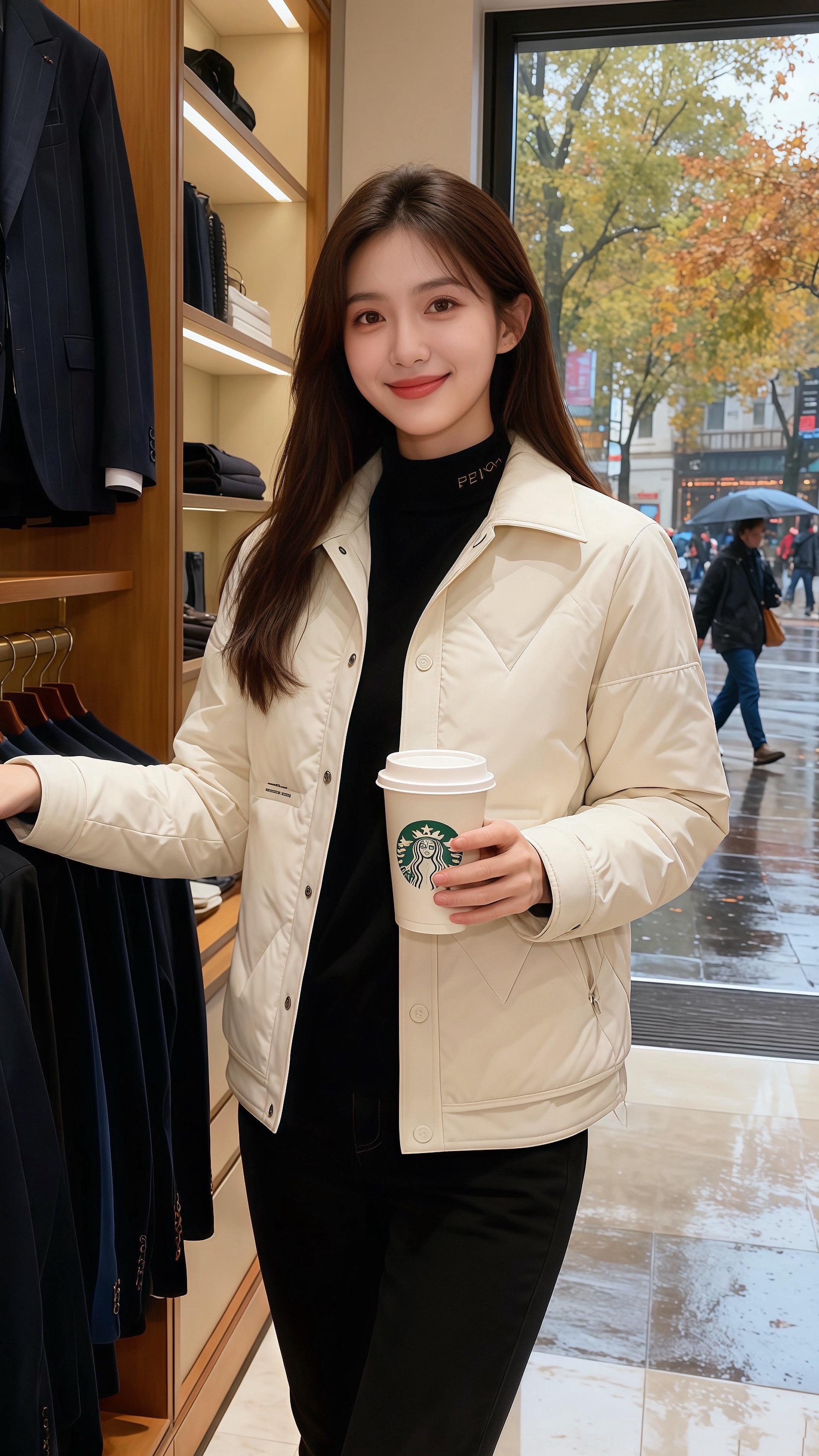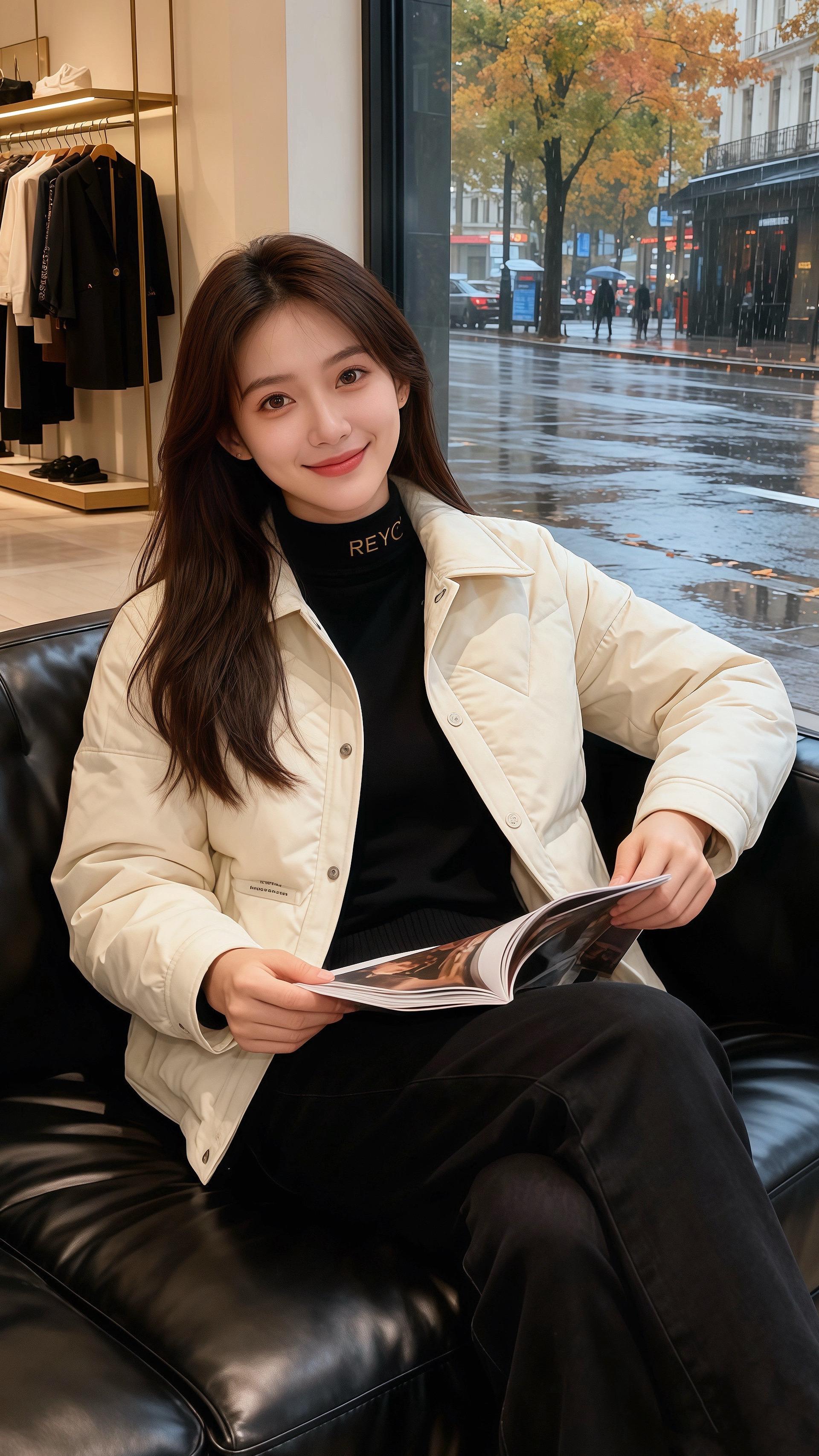 深秋雨街,她坐在男装店皮沙发里翻画册,米白菱格棉服衬得侧脸软乎乎的。领口露出的黑高领绣着细金字母,像把温柔别在了颈间,连翻页的指尖都浸着暖。