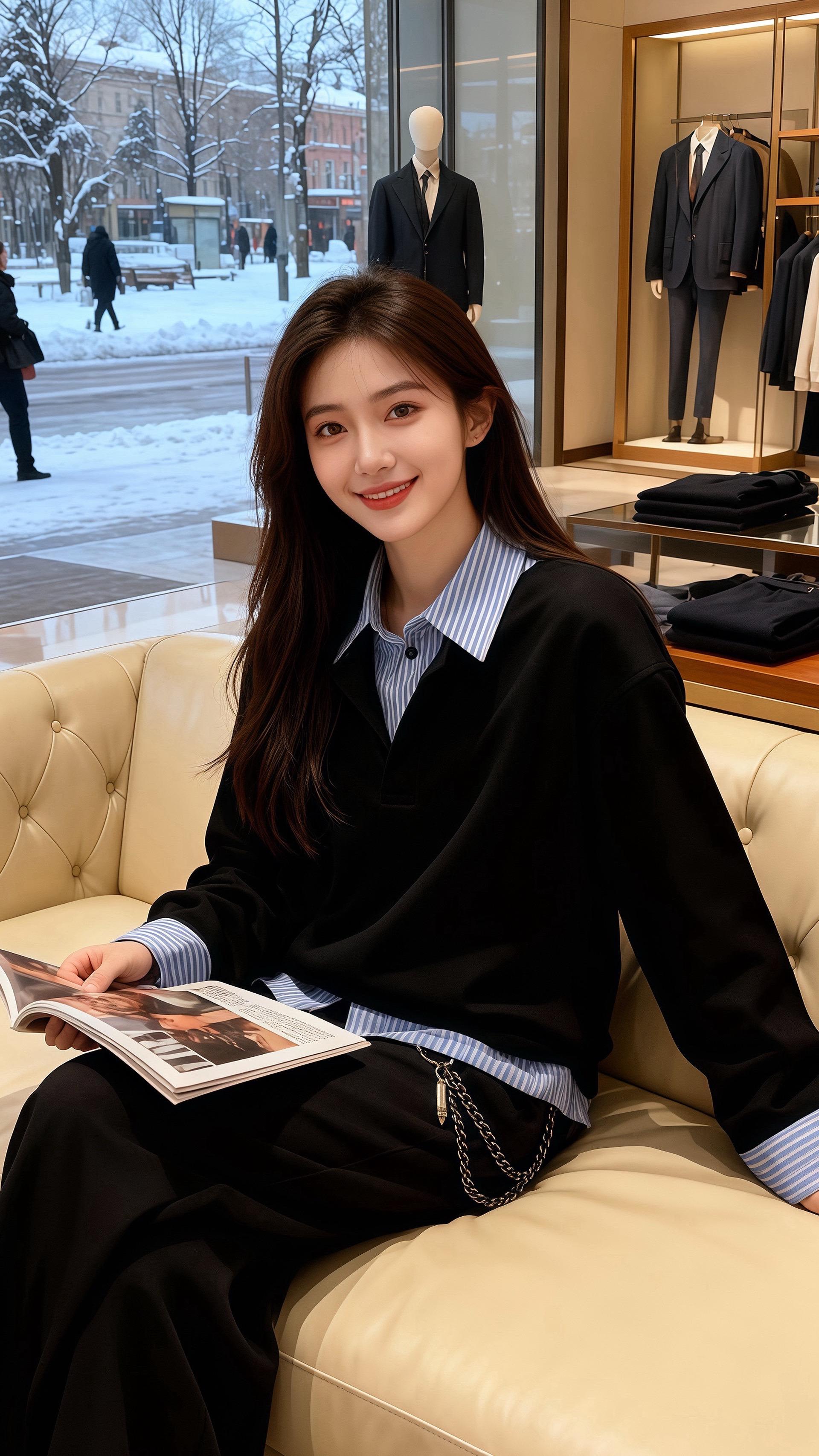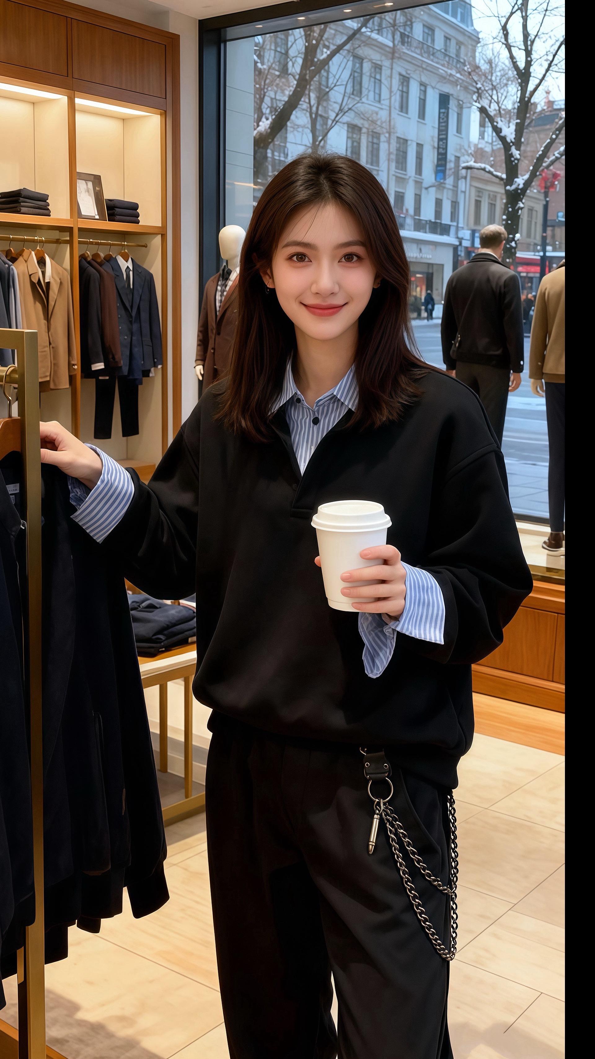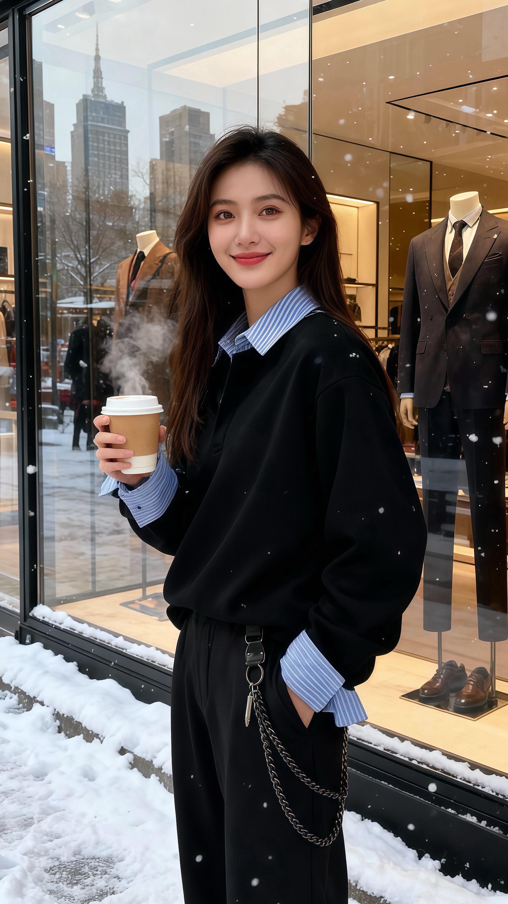 纸杯氤氲的白气里,她的穿搭像首妥帖的诗——不抢镜,却让整间冷调的男装店都暖了。后来陈默总说,那天他没记住任何一件西装,只记得她站在雪光里,黑卫衣软得像晚归时的灯,衬衫边又清得像初见的晨。
